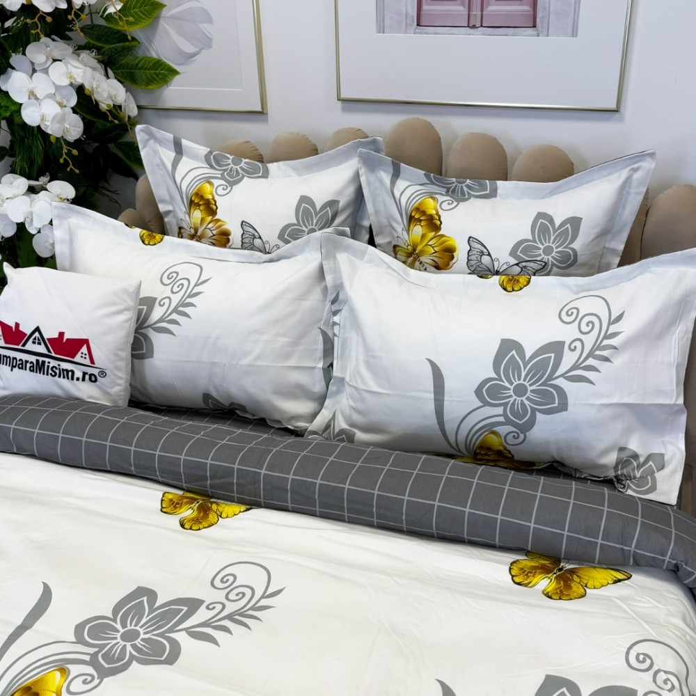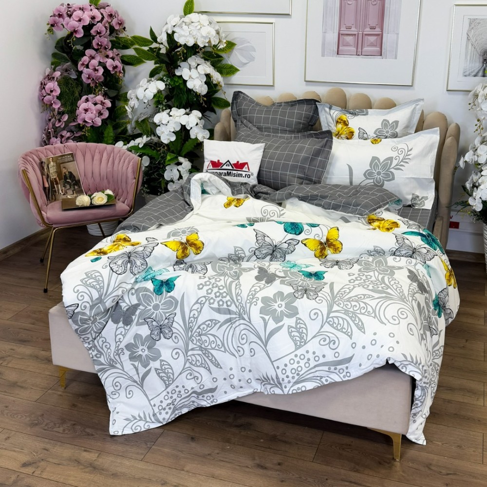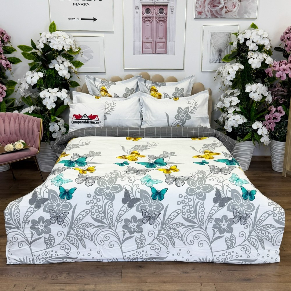 Lenjerie pat dublu, FINET, cu elastic, 6 piese, Alb, Gri, Fluturi, Primavara Casa, cod produs: PRM-FE-B916