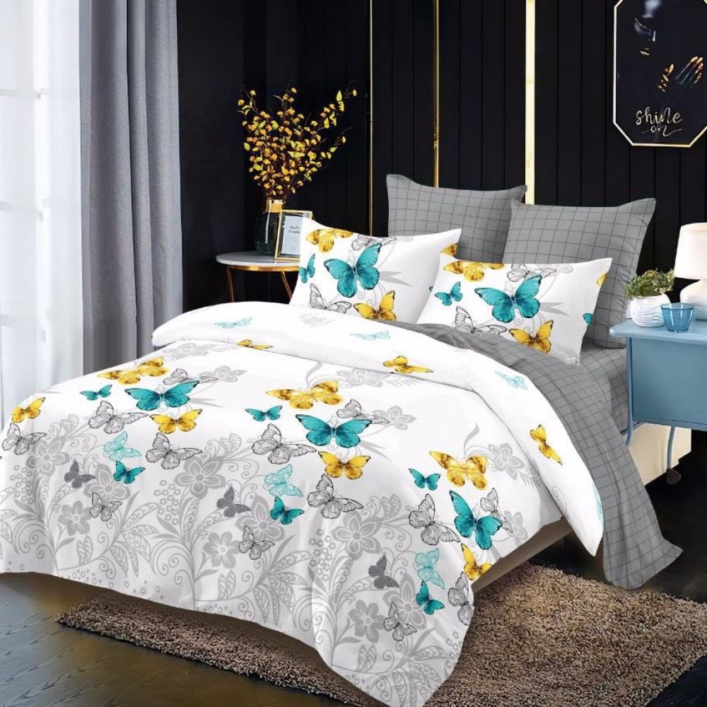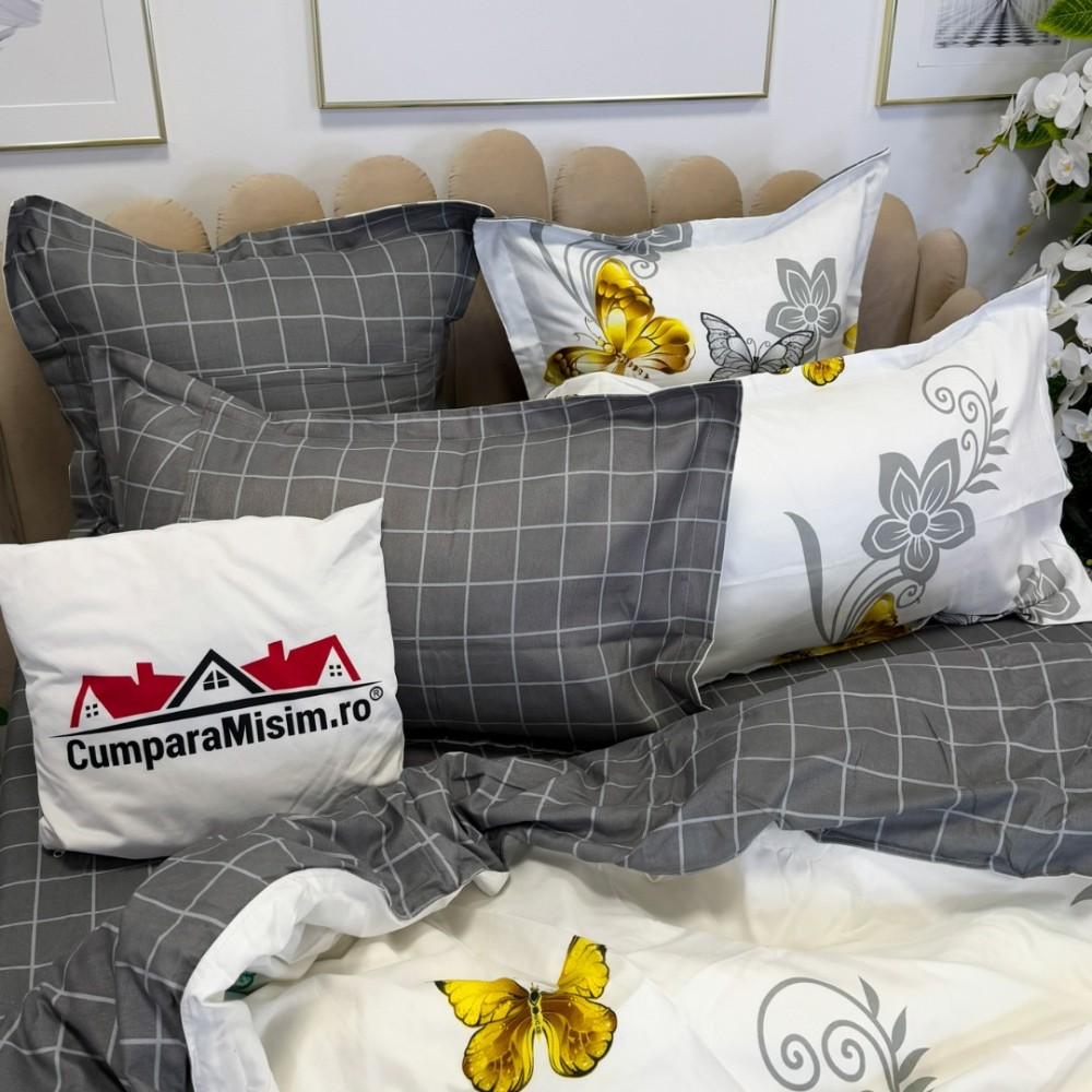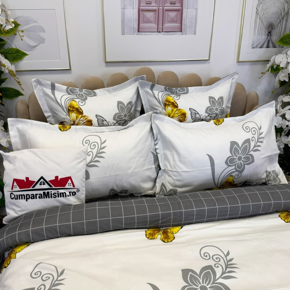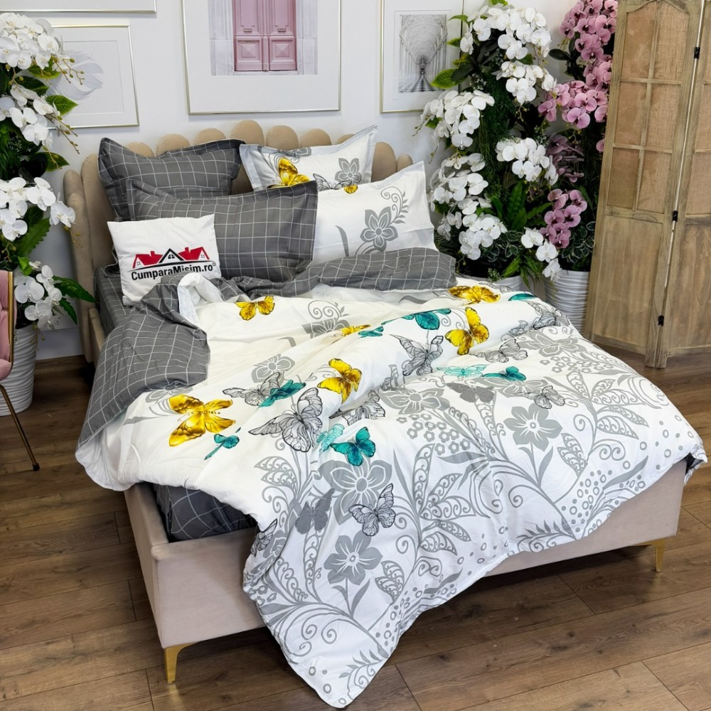 Lenjerie pat dublu, FINET, cu elastic, 6 piese, Alb, Gri, Fluturi, Primavara Casa, cod produs: PRM-FE-B916