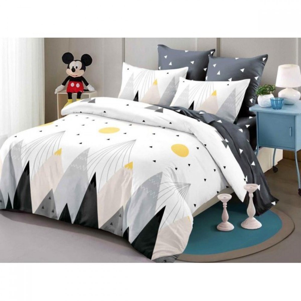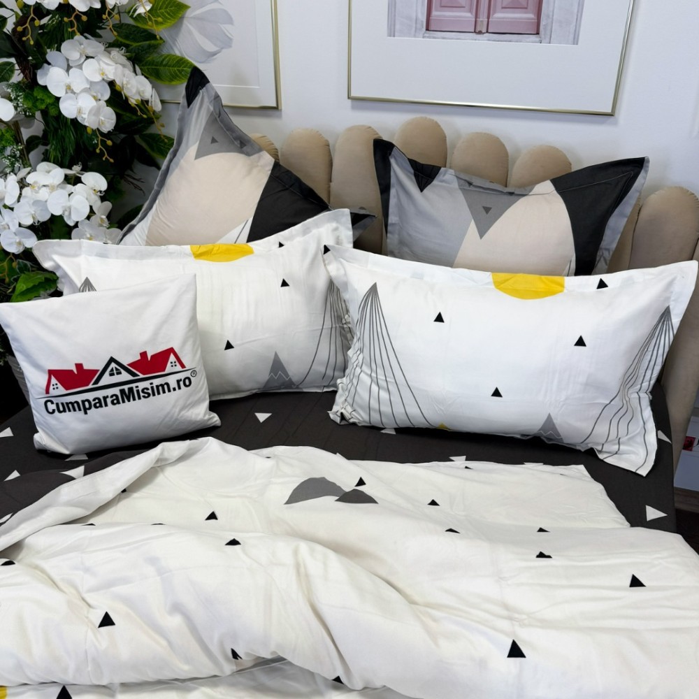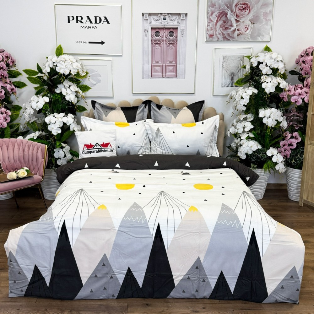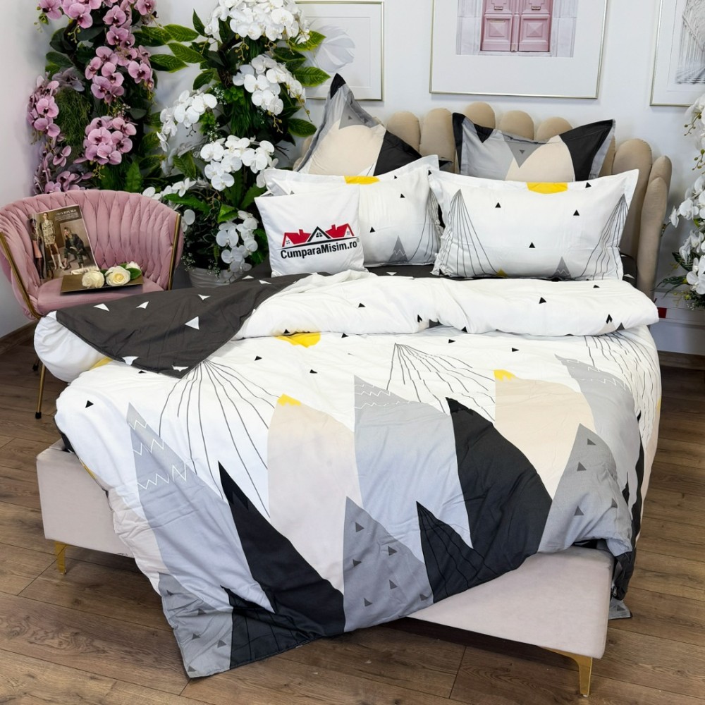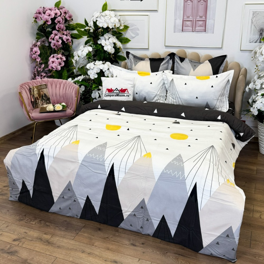 Lenjerie pat dublu, FINET, cu elastic, 6 piese, Alb, Gri, Munti, Abstract, Primavara Casa, cod produs: PRM-FE-B877