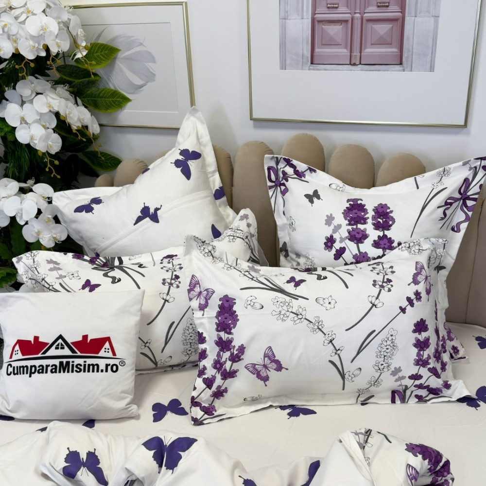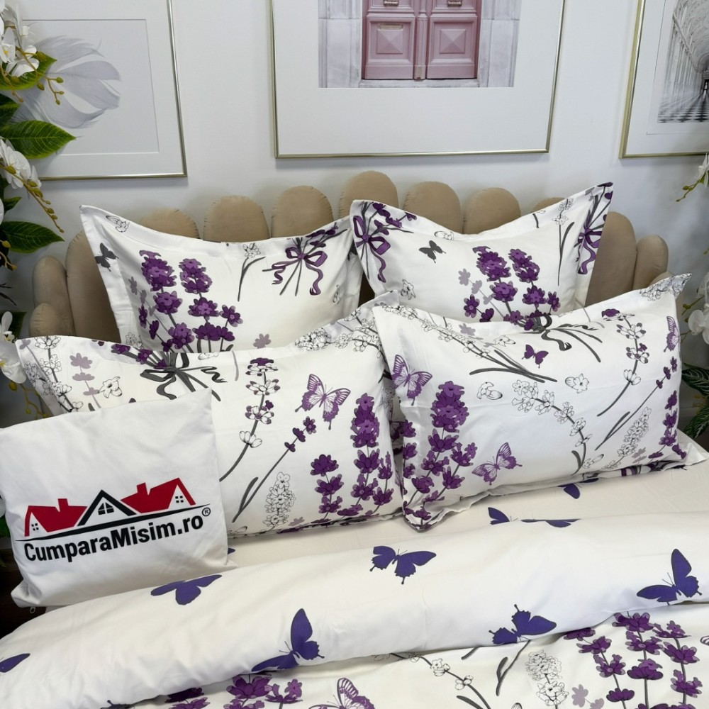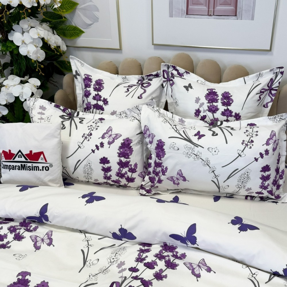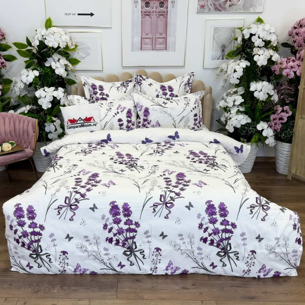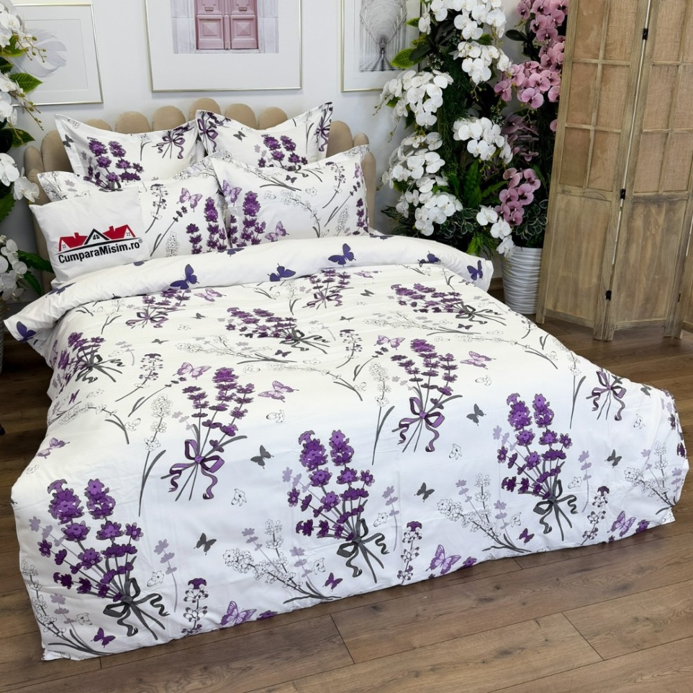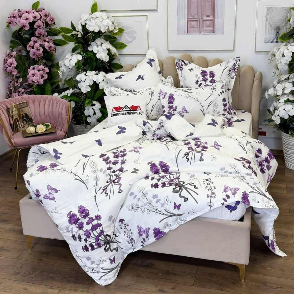 Lenjerie pat dublu, FINET, cu elastic, 6 piese, Alb, Mov, Lavanda, Primavara Casa, cod produs: PRM-FE-B930