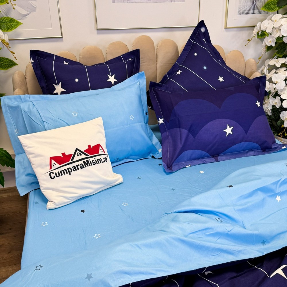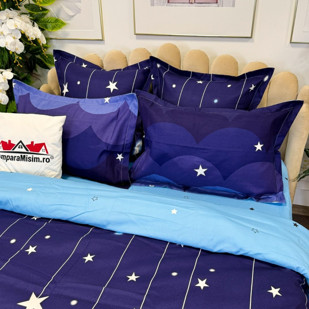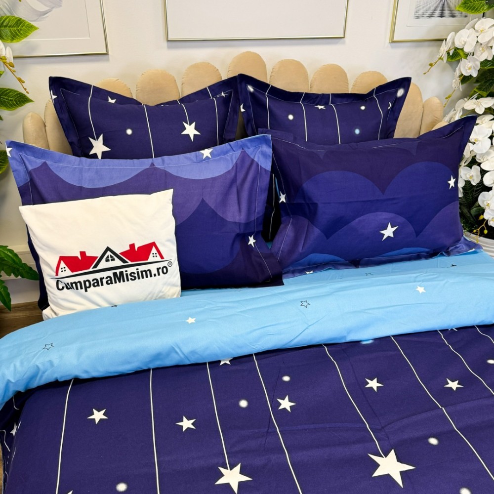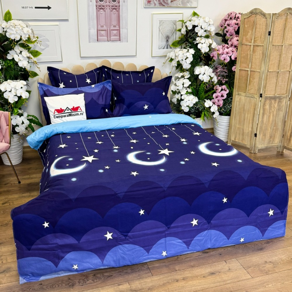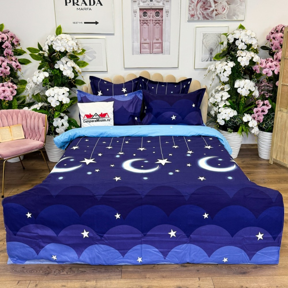 Lenjerie pat dublu, FINET, cu elastic, 6 piese, Albastru, Alb, Stelute, Luna, Primavara Casa, cod produs: PRM-FE-B850