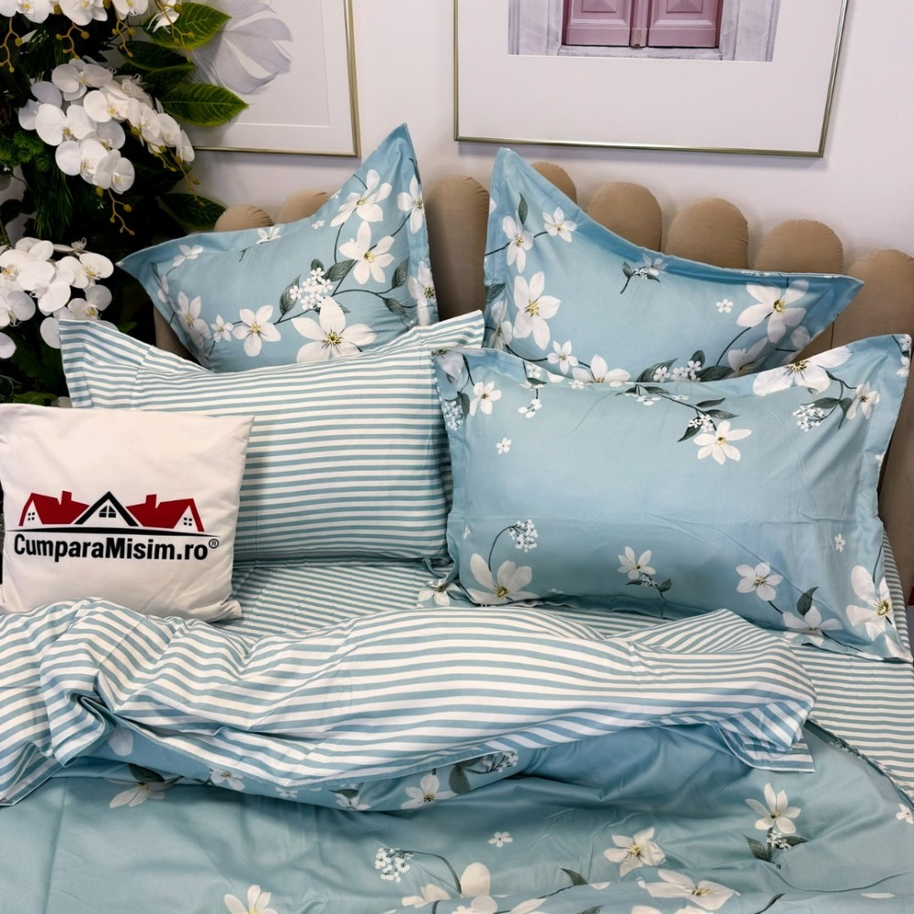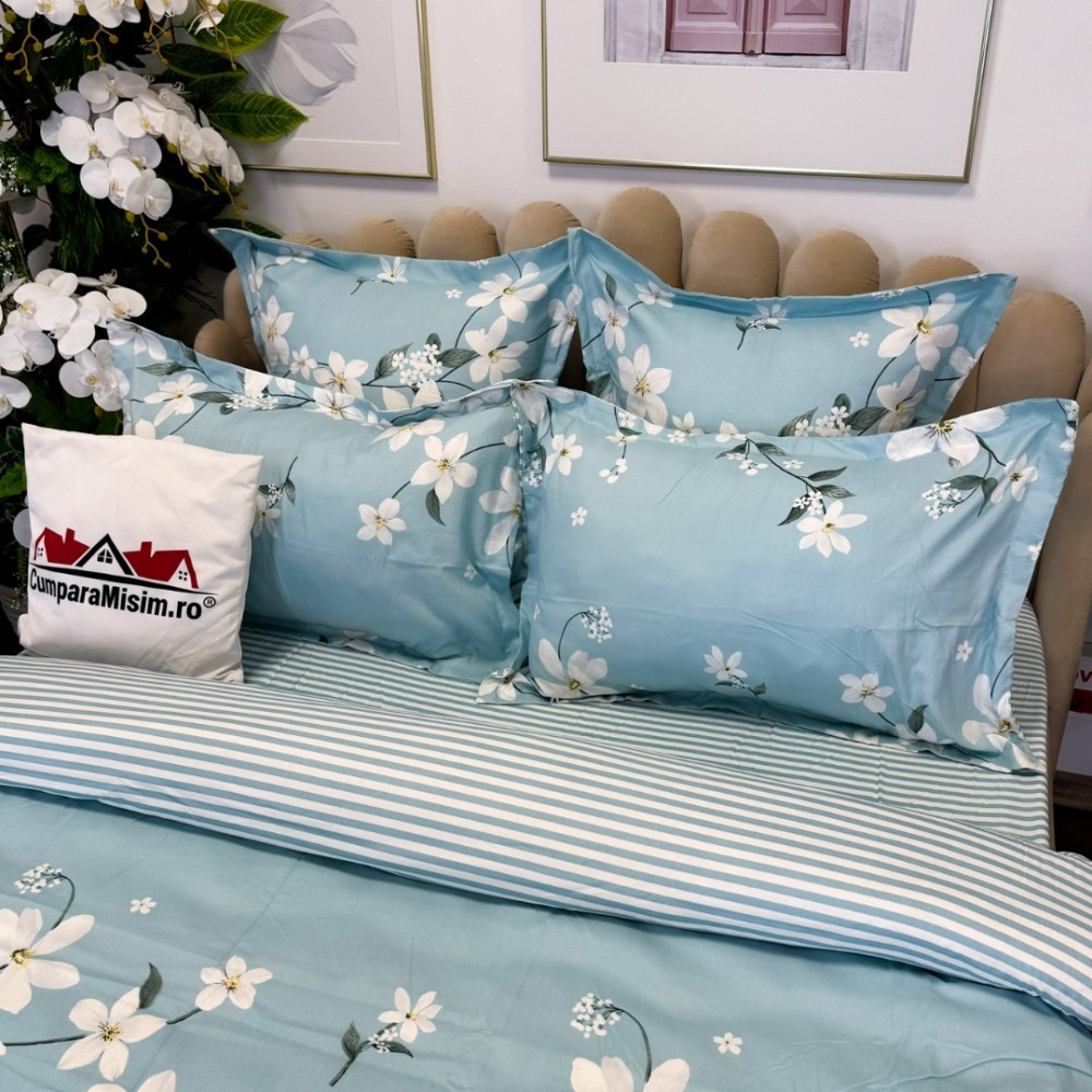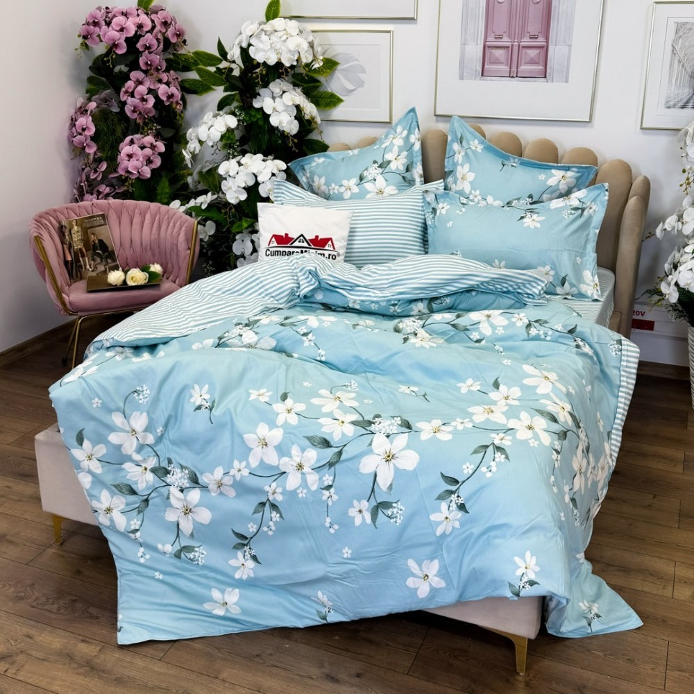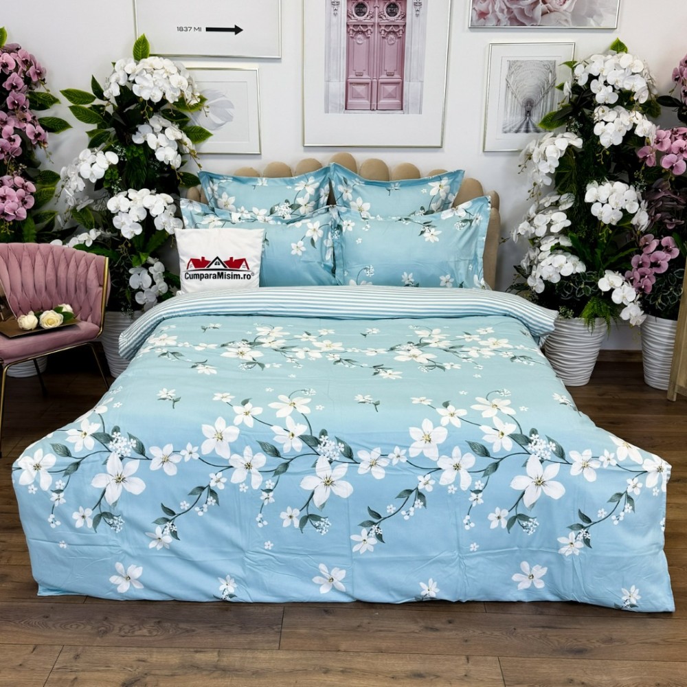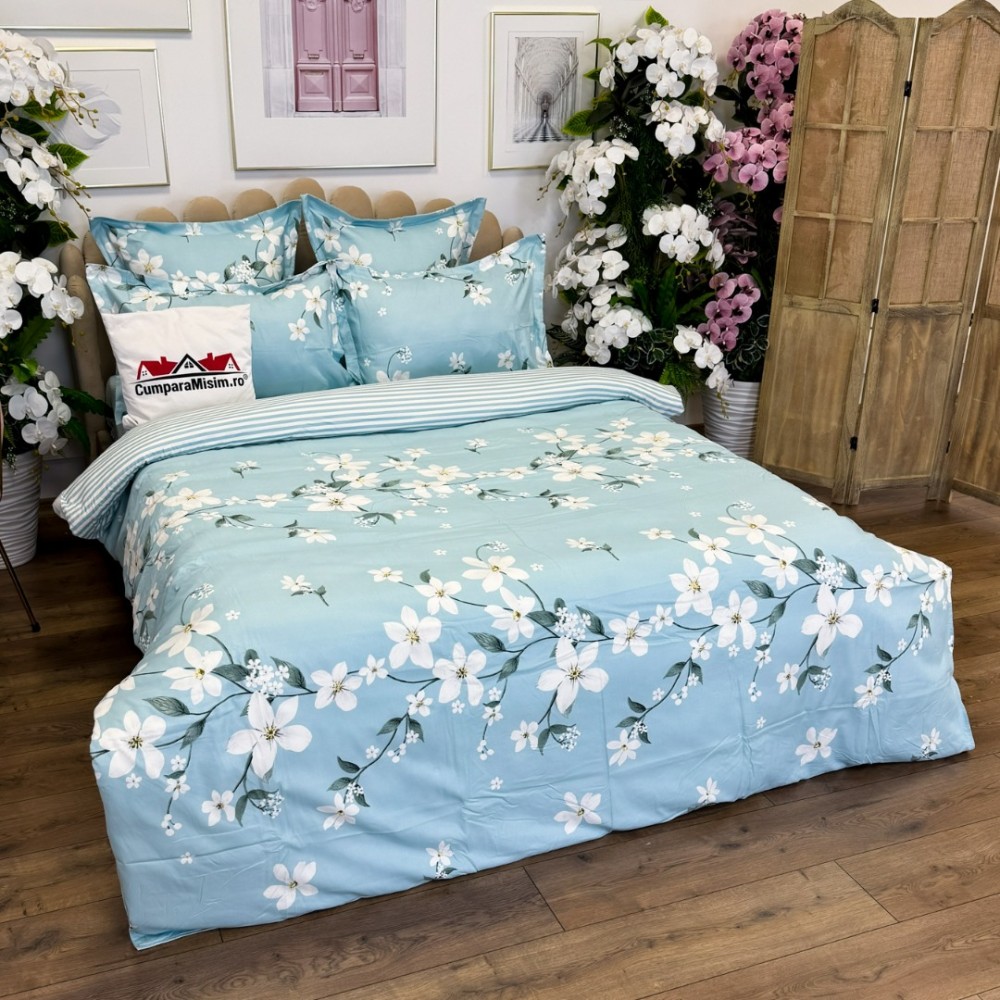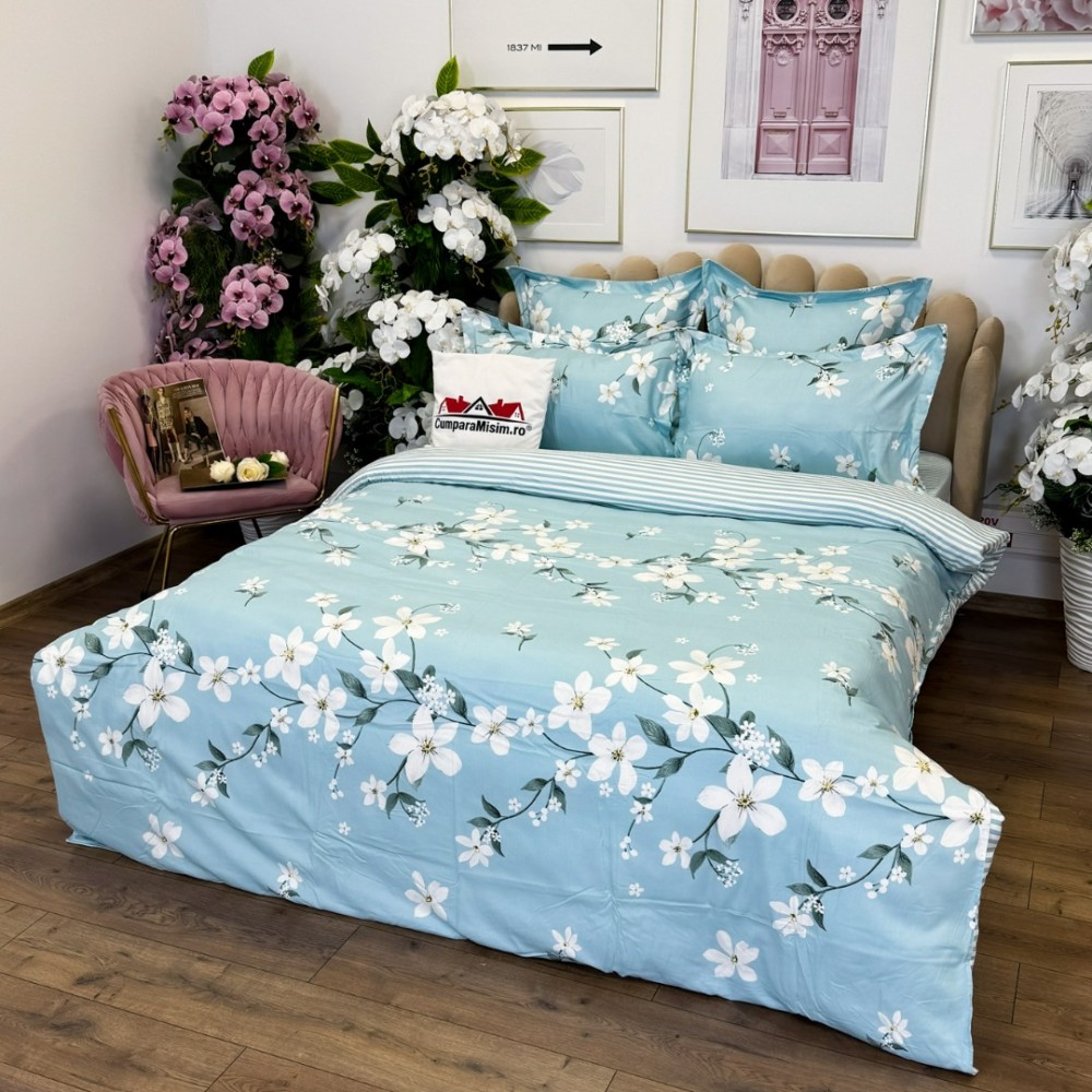Lenjerie pat dublu, FINET, cu elastic, 6 piese, Bleu, Alb, Flori de Primavara, Primavara Casa, cod produs: PRM-FE-B856