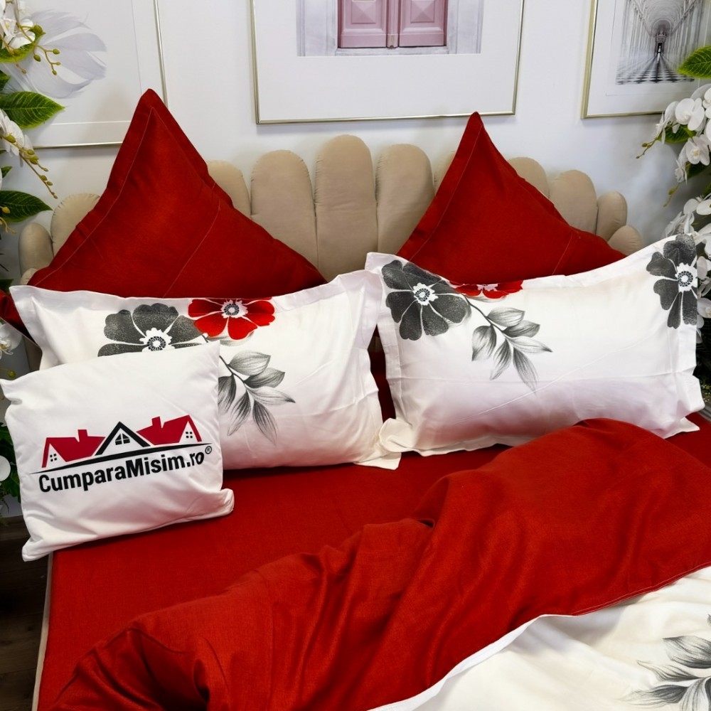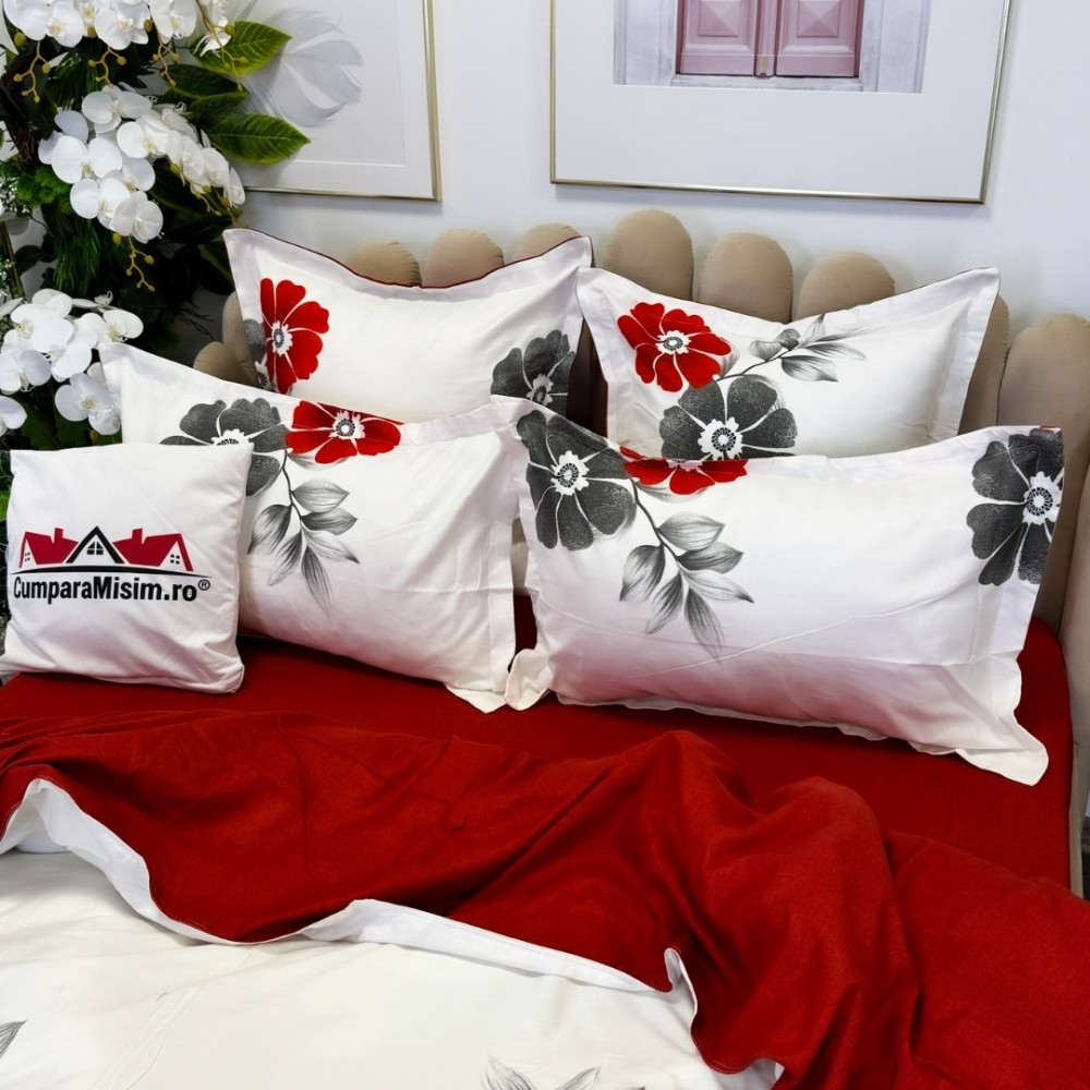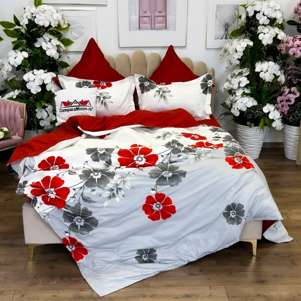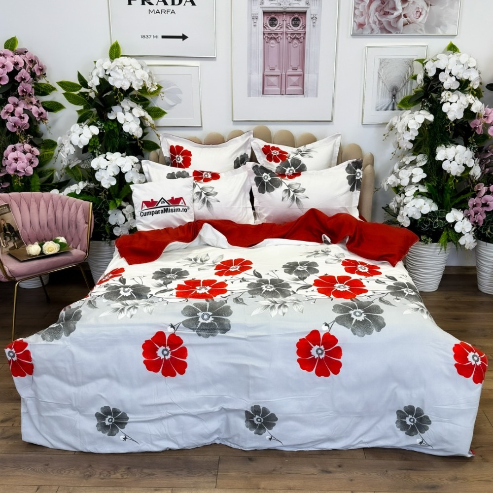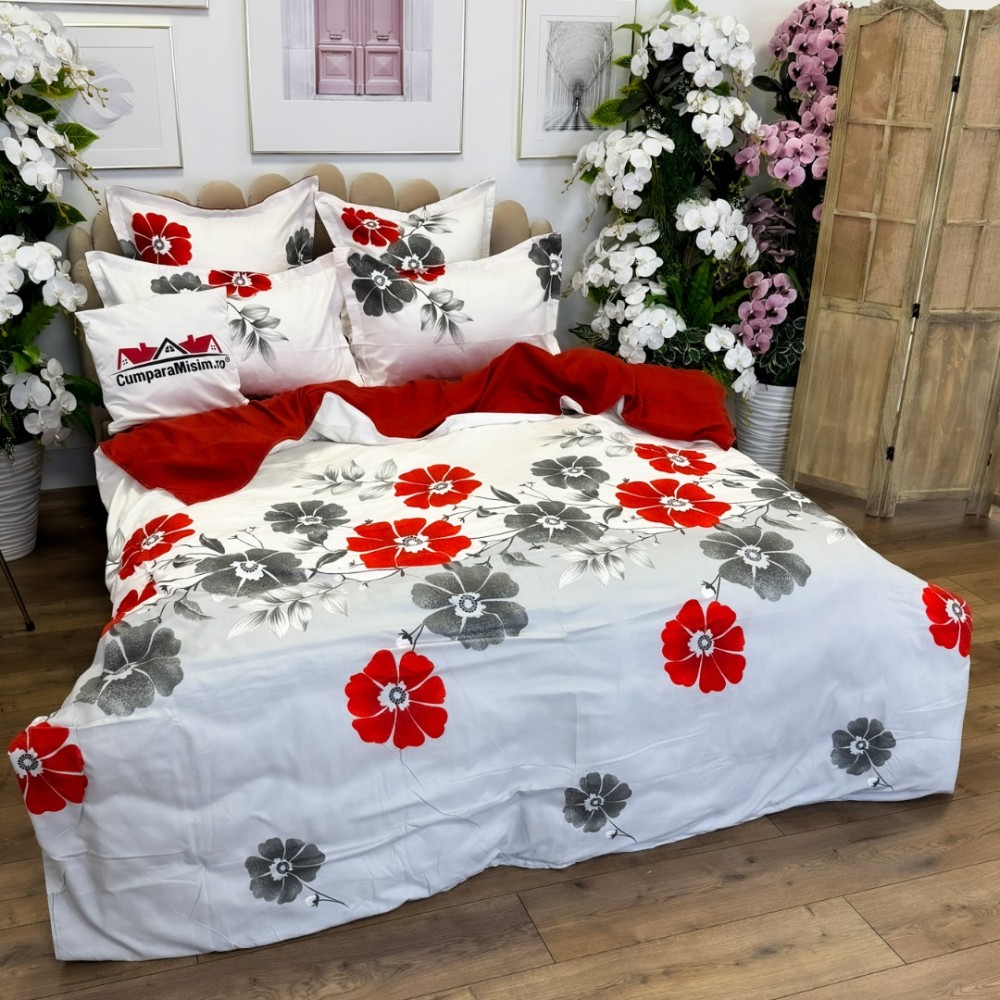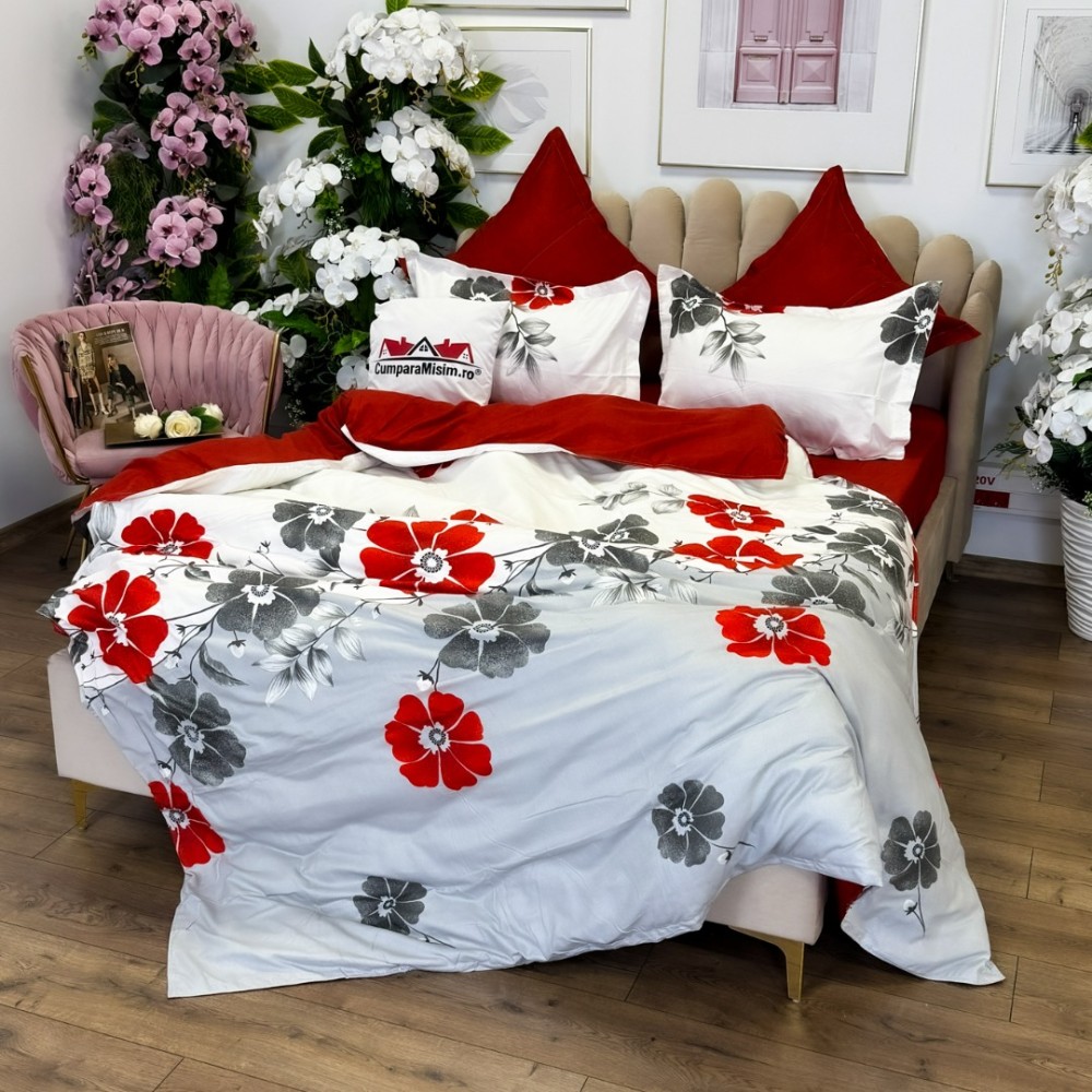 Lenjerie pat dublu, FINET, cu elastic, 6 piese, Gri, Rosu, Flori, Primavara Casa, cod produs: PRM-FE-B941
