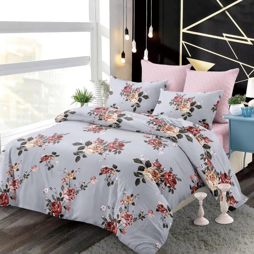 Lenjerie pat dublu, FINET, cu elastic, 6 piese, Gri, Roz, Flori, Primavara Casa, cod produs: PRM-FE-B107