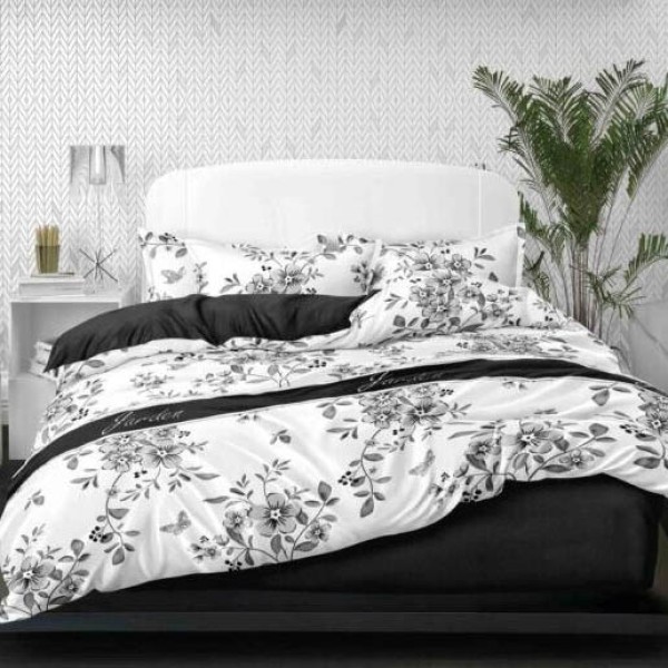 Lenjerie pat dublu, bumbac satinat, 4 piese, Alb, Negru, flori, Talo, cod produs: SKT-SN-63