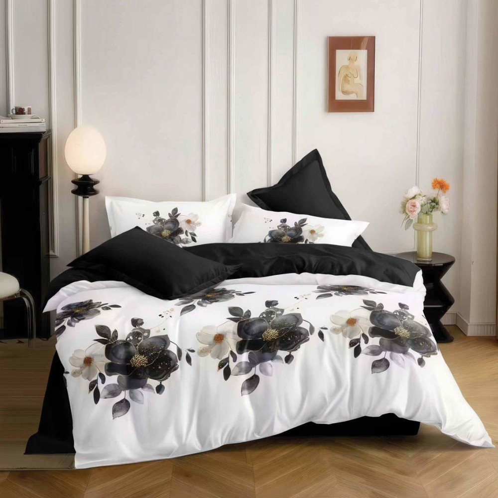 Lenjerie pat dublu, bumbac satinat, 4 piese, Alb, Negru, flori, Talo, cod produs: SKT-SN-26