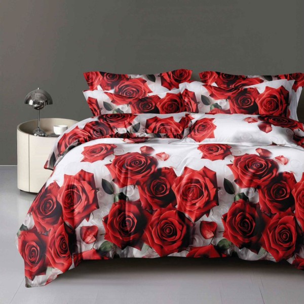 Lenjerie pat dublu, bumbac satinat, 4 piese, Alb, Rosu, trandafiri, Talo, cod produs: SKT-SN-01