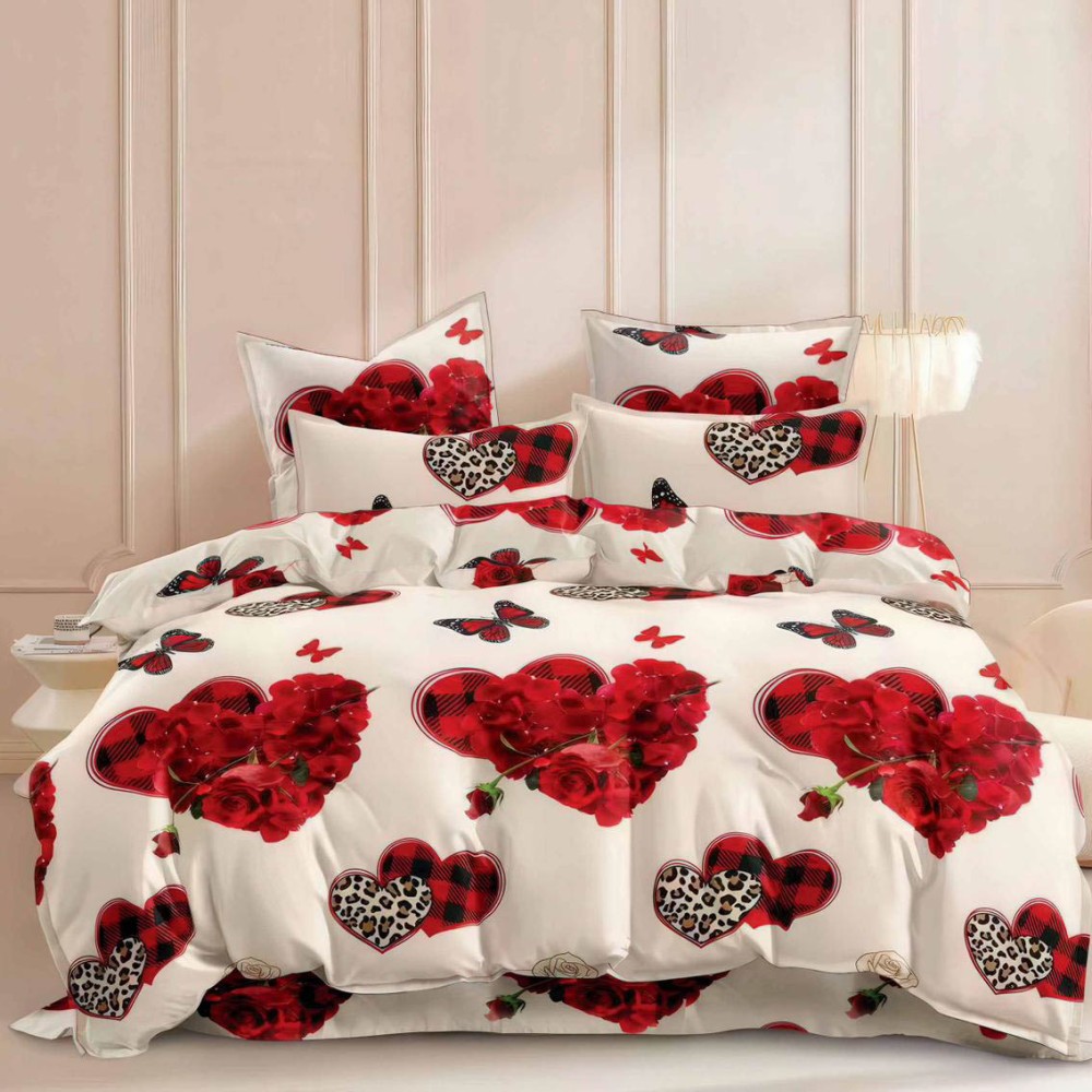 Lenjerie pat dublu, bumbac satinat, 4 piese, Crem, Rosu, inimioare, Talo, cod produs: SKT-SN-02