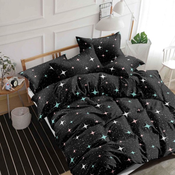 Lenjerie pat dublu, bumbac satinat, 4 piese, Negru, stelute, Talo, cod produs: SKT-SN-38