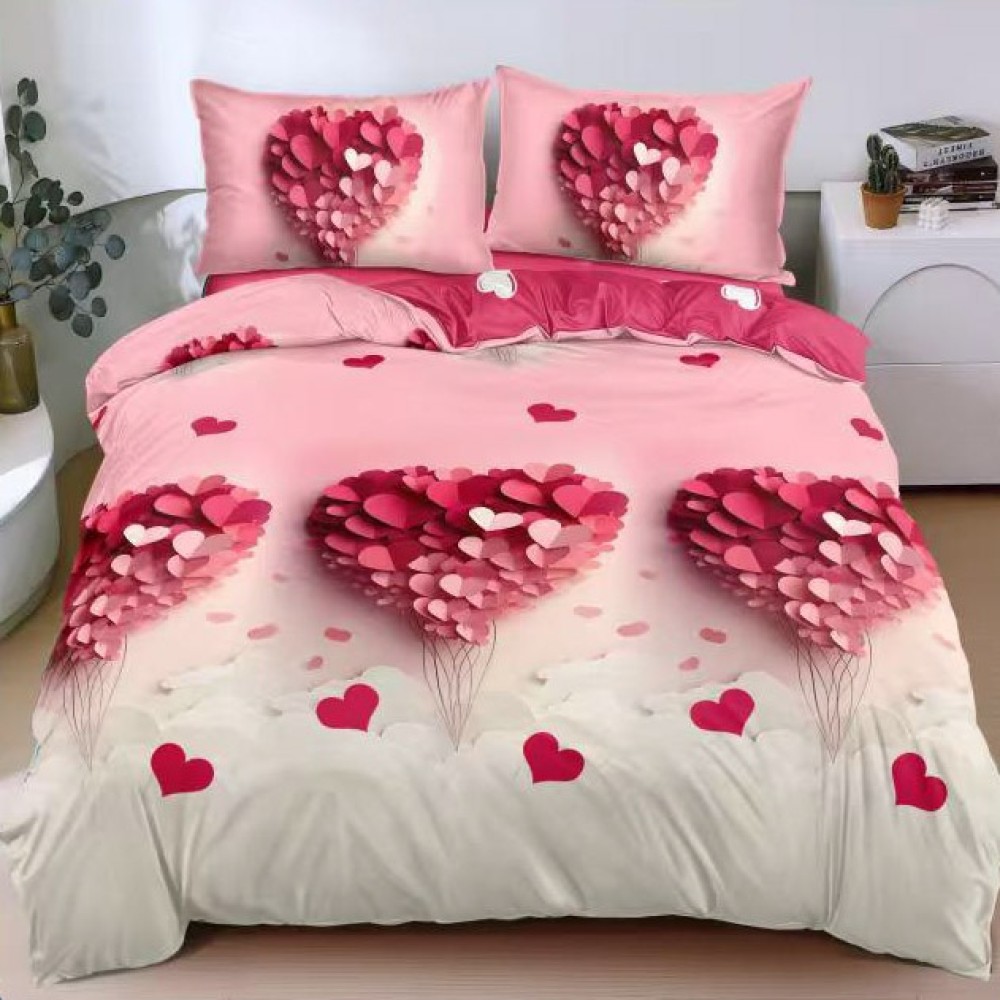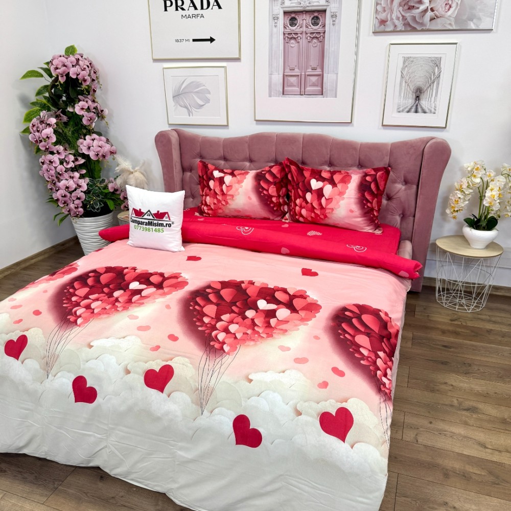 Lenjerie pat dublu, bumbac satinat, cearsaf clasic, 4 piese, Alb, Roz, inimioare, Johny Home Pucioasa, cod produs: SPR-A50-722