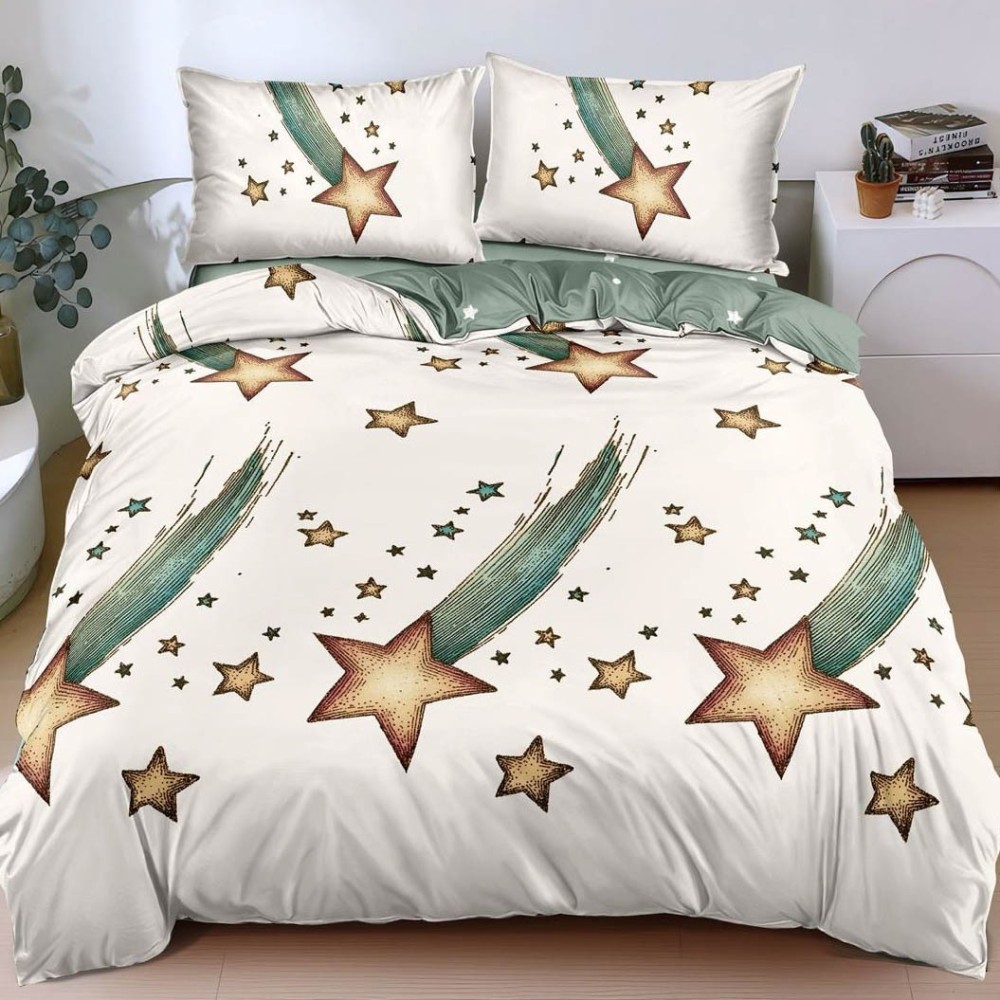 Lenjerie pat dublu, bumbac satinat, cearsaf clasic, 4 piese, Alb, stelute, Johny Home Pucioasa, cod produs: SPR-A50-715