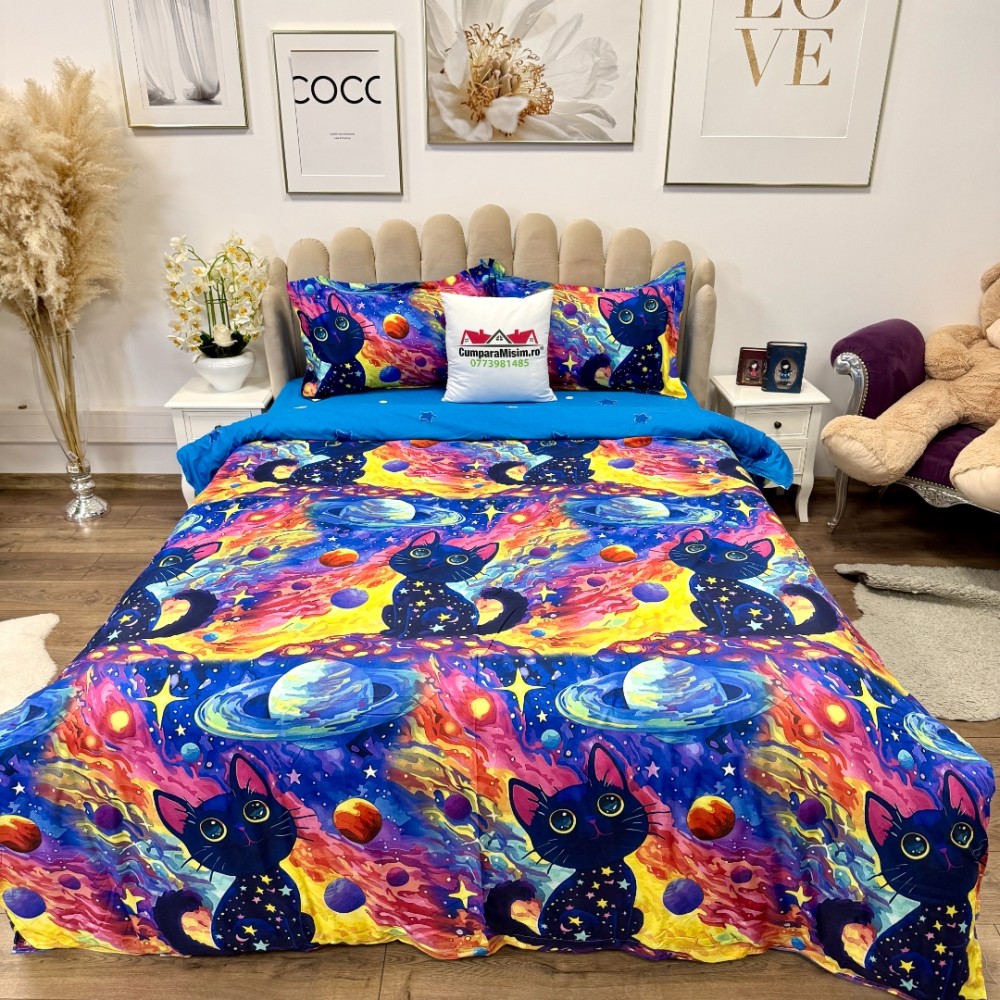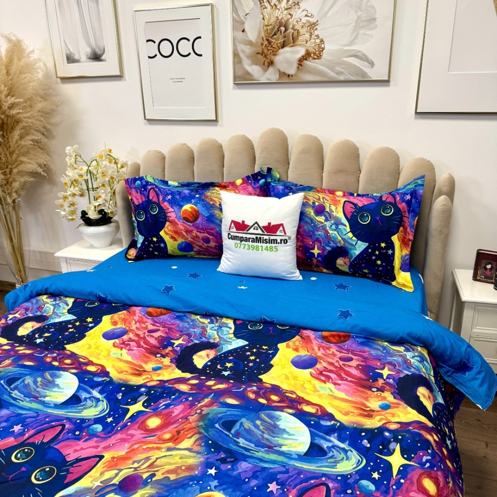 Lenjerie pat dublu, bumbac satinat, cearsaf clasic, 4 piese, Albastru, Mov, Galben, pisicute, planete, Johny Home Pucioasa, cod produs: SPR-A50-727