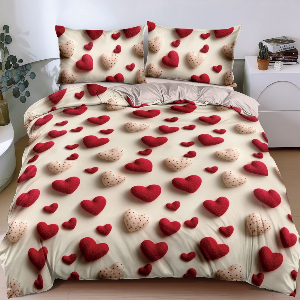 Lenjerie pat dublu, bumbac satinat, cearsaf clasic, 4 piese, Bej, inimioare, Johny Home Pucioasa, cod produs: SPR-A50-694
