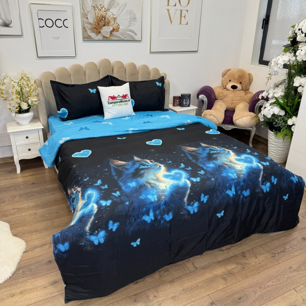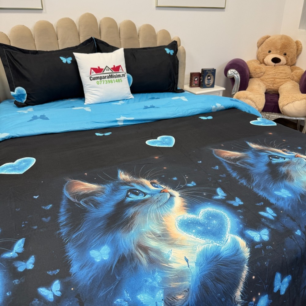 Lenjerie pat dublu, bumbac satinat, cearsaf clasic, 4 piese, Negru, Albastru, pisicute si inimioare, Johny Home Pucioasa, cod produs: SPR-A50-718