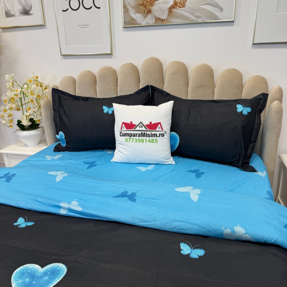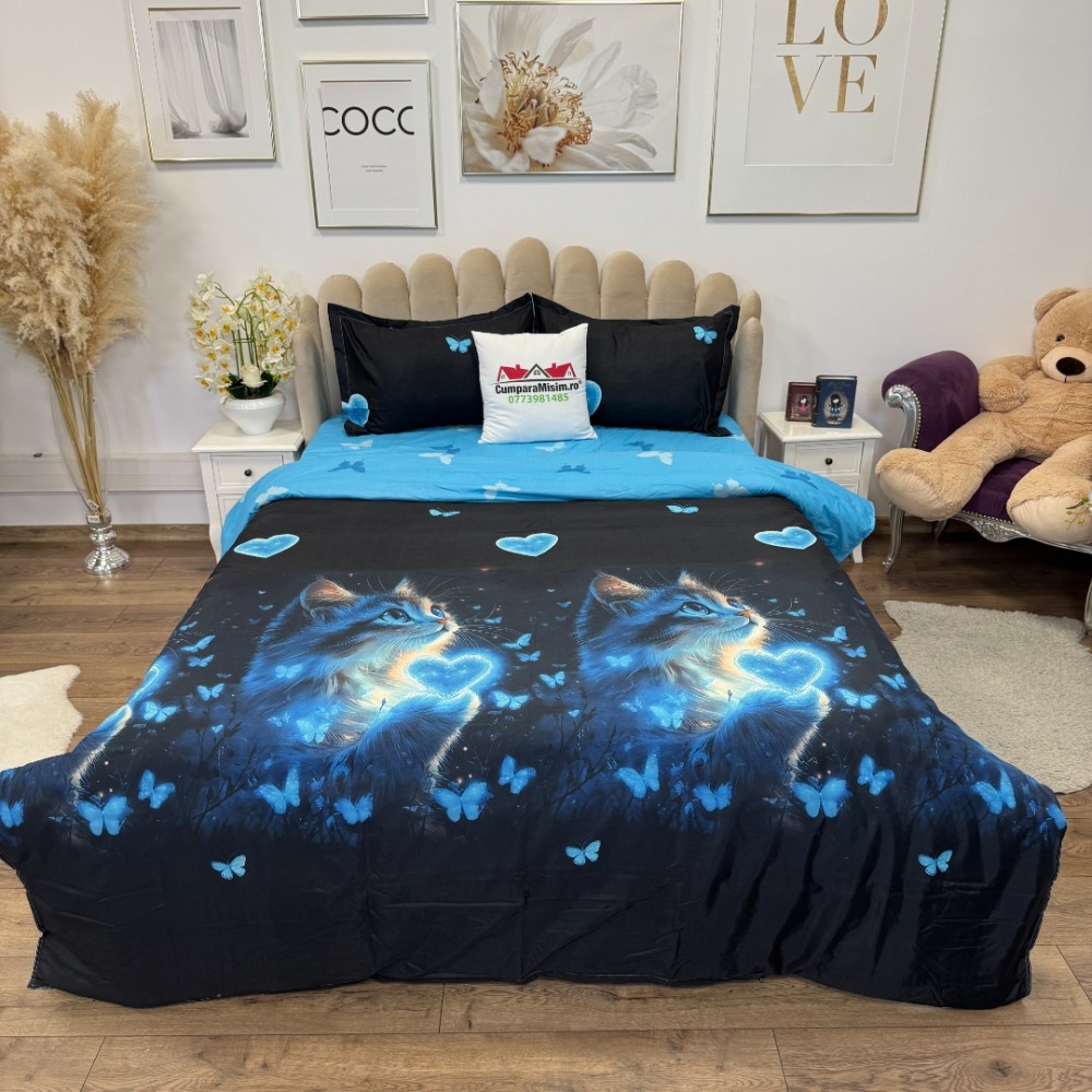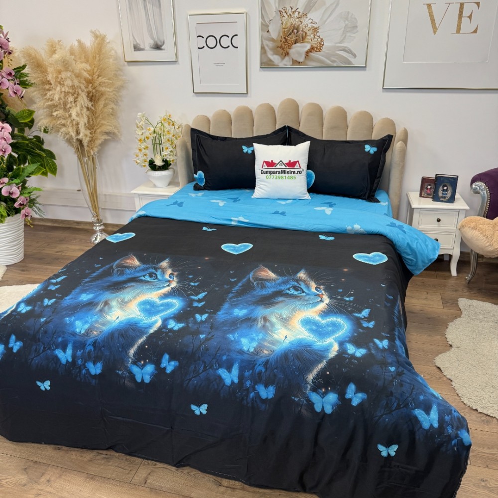 Lenjerie pat dublu, cearsaf clasic, 4 piese, Negru, Albastru, pisicute si inimioare, Johny Home Pucioasa, cod produs: SPR-xA50-718