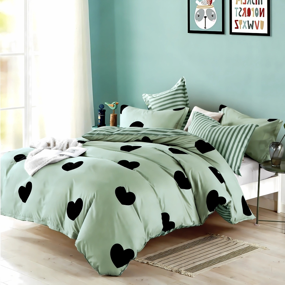 Lenjerie pat dublu, bumbac satinat, cu doua feţe, 4 piese, Verde, inimioare, Casa Creative Elegance Pucioasa, cod produs: BCC-LBS104
