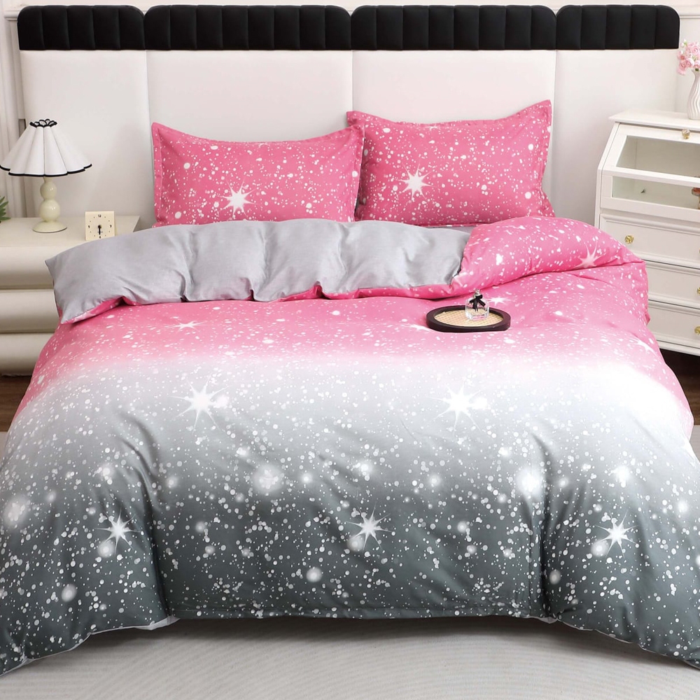 Lenjerie pat dublu cu Elastic, bumbac satinat, Gri, Roz, stelute, Casa Creative Elegance Pucioasa, cod produs: BCC-SE-12