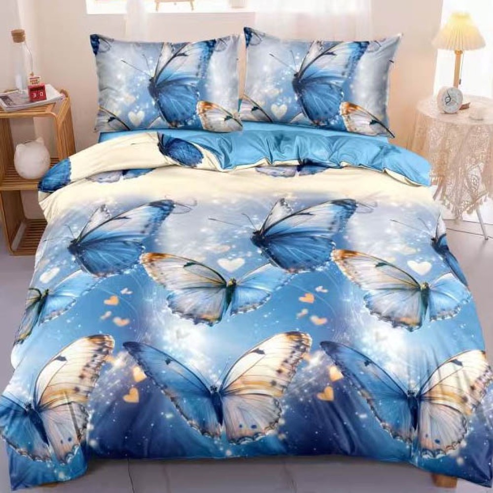 Lenjerie pat dublu cu Elastic, bumbac satinat, Albastru, fluturi, Johny Home Pucioasa, cod produs: SPR-E-185
