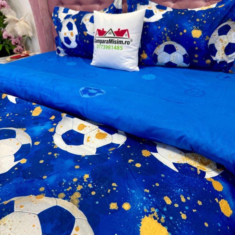 Lenjerie pat dublu cu Elastic, Albastru, mingii de fotbal, Johny Home Pucioasa, cod produs: SPR-xE-189