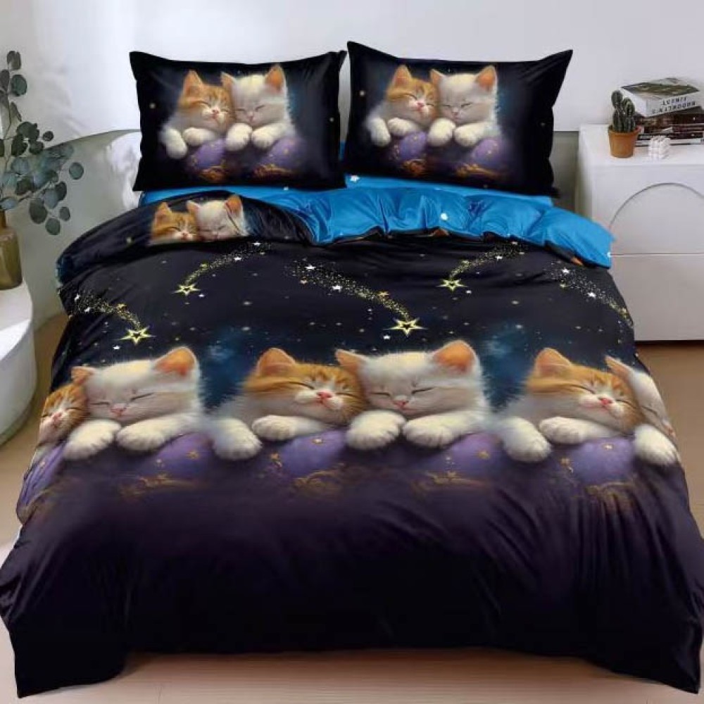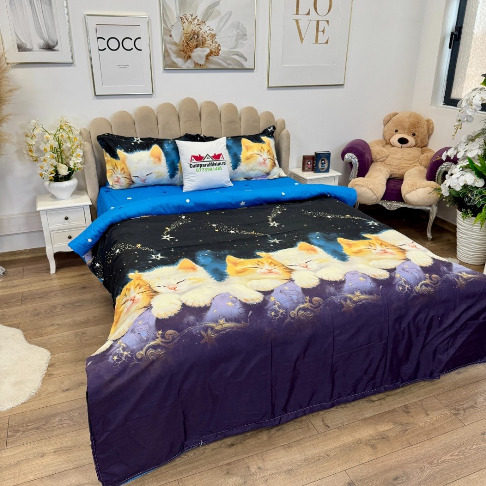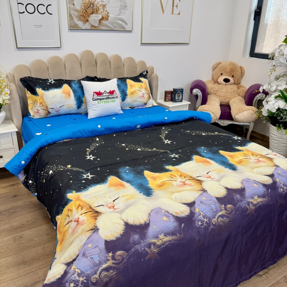 Lenjerie pat dublu cu Elastic, bumbac satinat, Albastru, Negru, pisicute, Johny Home Pucioasa, cod produs: SPR-E-183