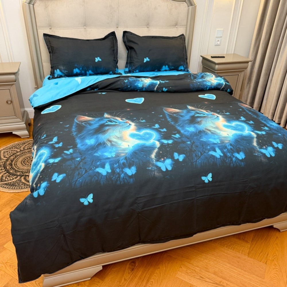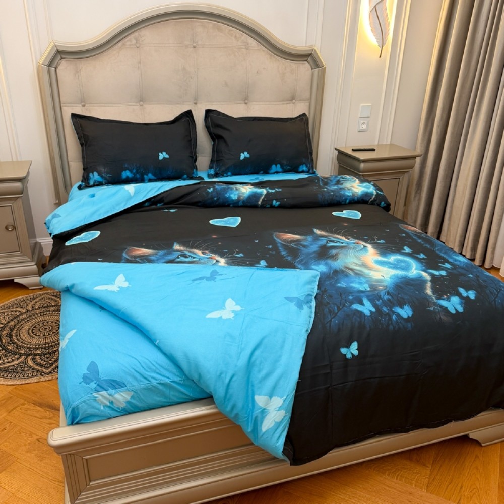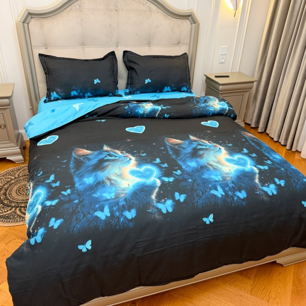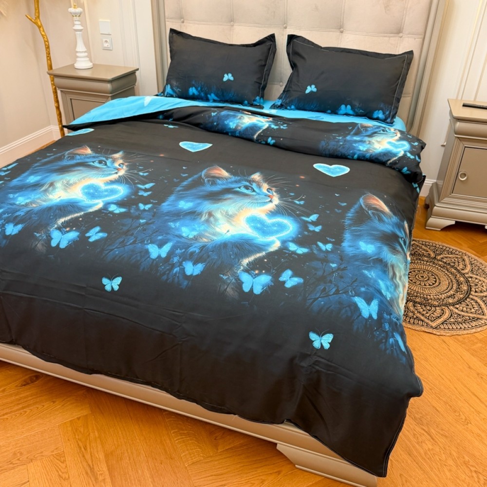 Lenjerie pat dublu cu Elastic, bumbac satinat, Albastru, Negru, pisicute cu inimioare, Johny Home Pucioasa, cod produs: SPR-E-173