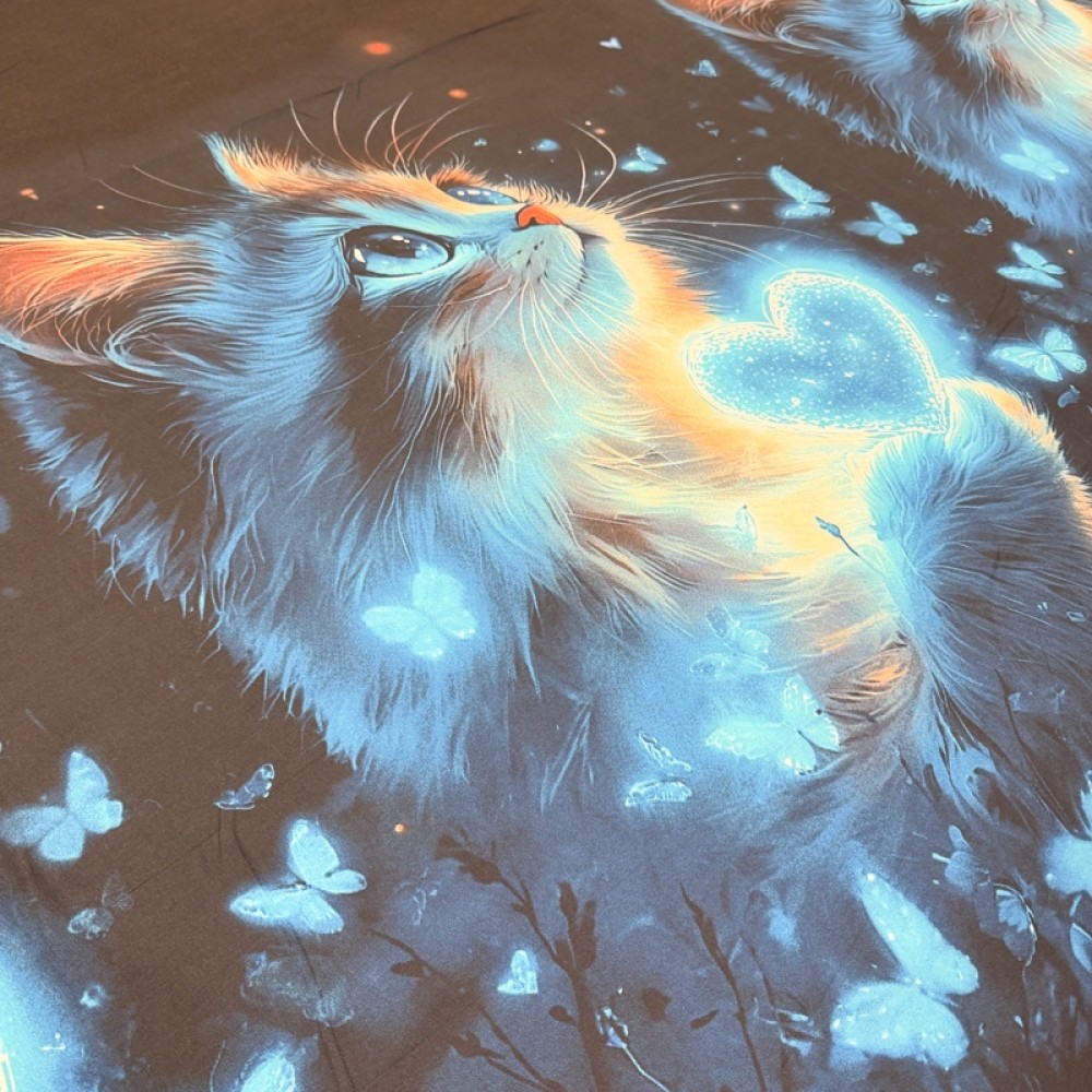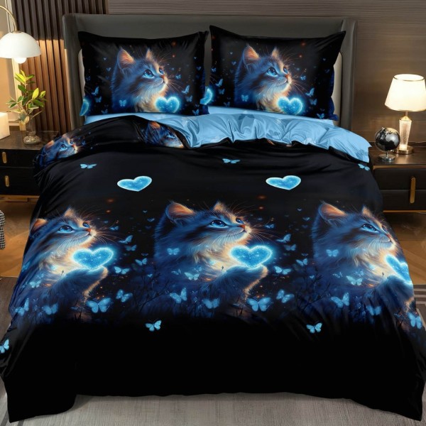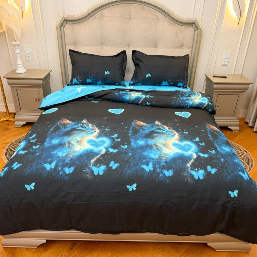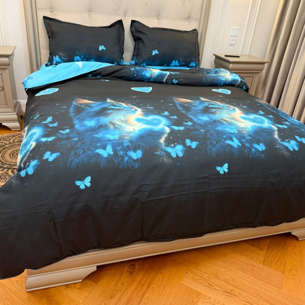 Lenjerie pat dublu cu Elastic, bumbac satinat, Albastru, Negru, pisicute cu inimioare, Johny Home Pucioasa, cod produs: SPR-E-173