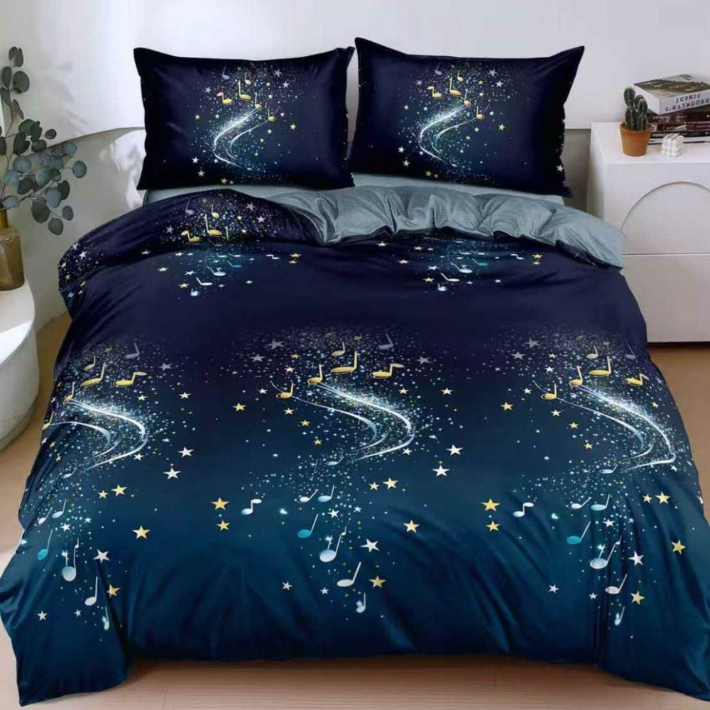 Lenjerie pat dublu cu Elastic, bumbac satinat, Albastru, stelute, note muzicale, Johny Home Pucioasa, cod produs: SPR-E-163