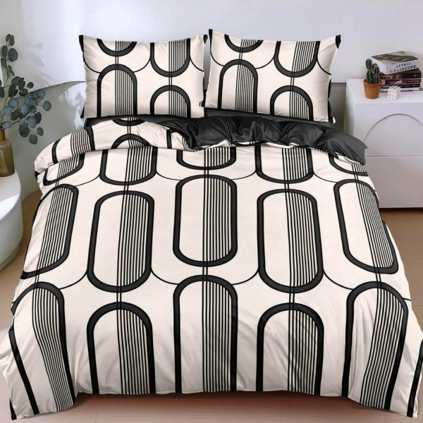 Lenjerie pat dublu cu Elastic, bumbac satinat, Crem, Negru, abstract, Johny Home Pucioasa, cod produs: SPR-E-167