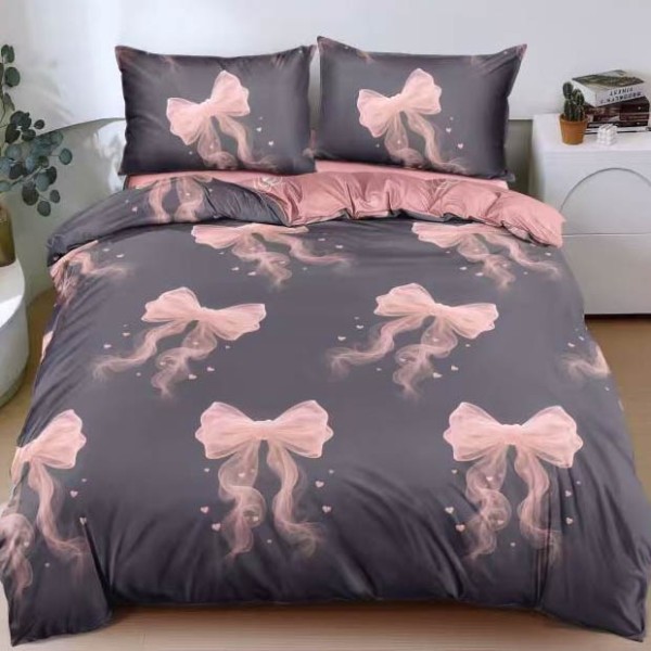 Lenjerie pat dublu cu Elastic, bumbac satinat, Gri, Roz, fundite, Johny Home Pucioasa, cod produs: SPR-E-176