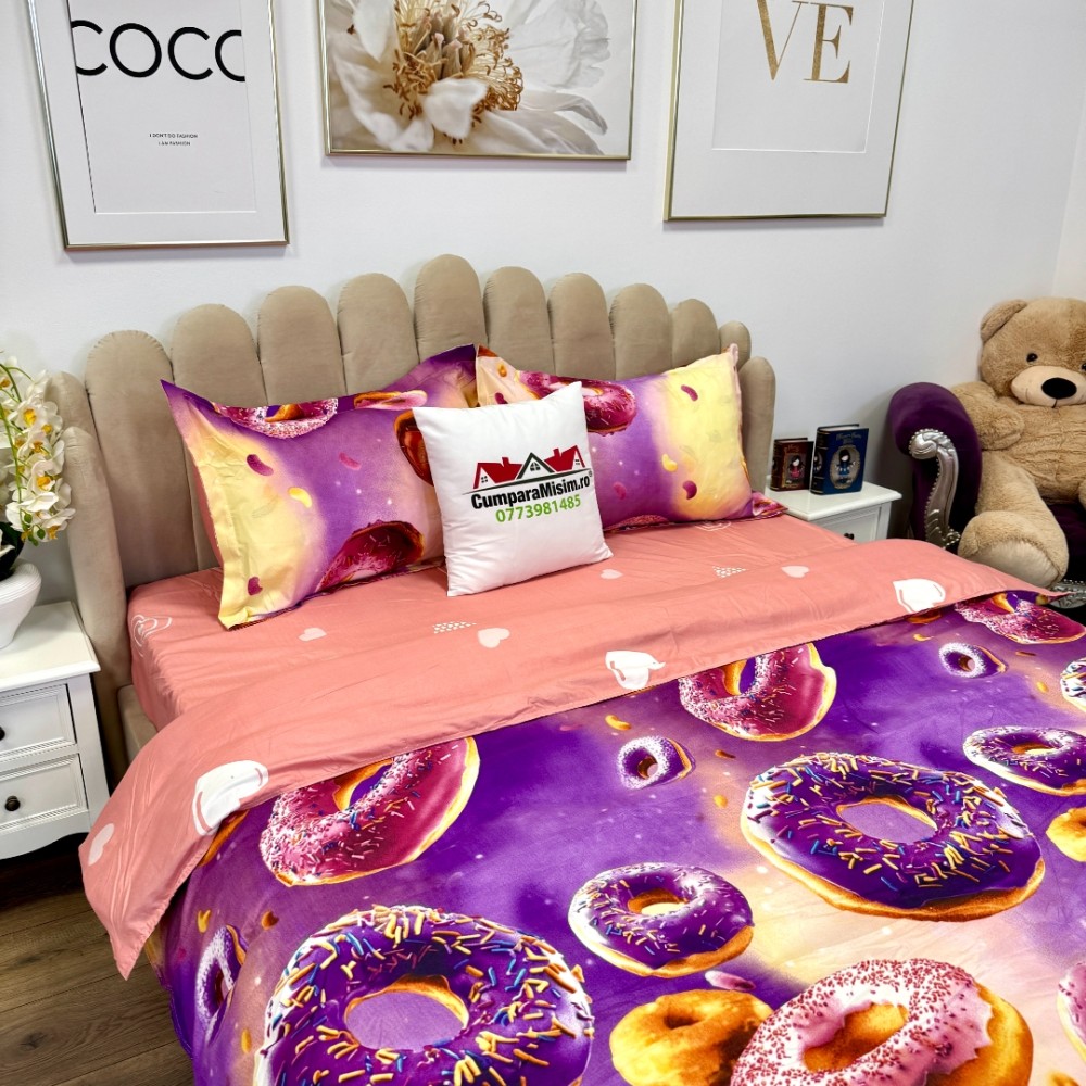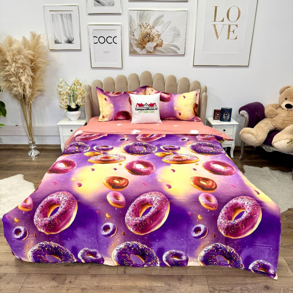 Lenjerie pat dublu cu Elastic, bumbac satinat, Mov, gogosi, Johny Home Pucioasa, cod produs: SPR-E-174