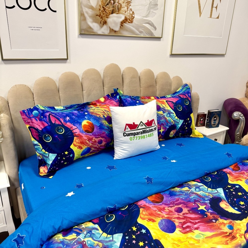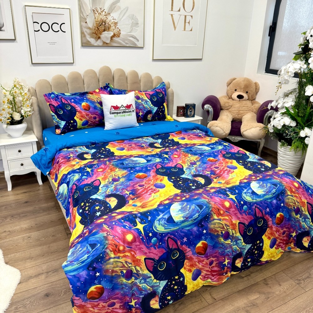 Lenjerie pat dublu cu Elastic, Roz, Mov, planete si pisicute, Johny Home Pucioasa, cod produs: SPR-xE-181