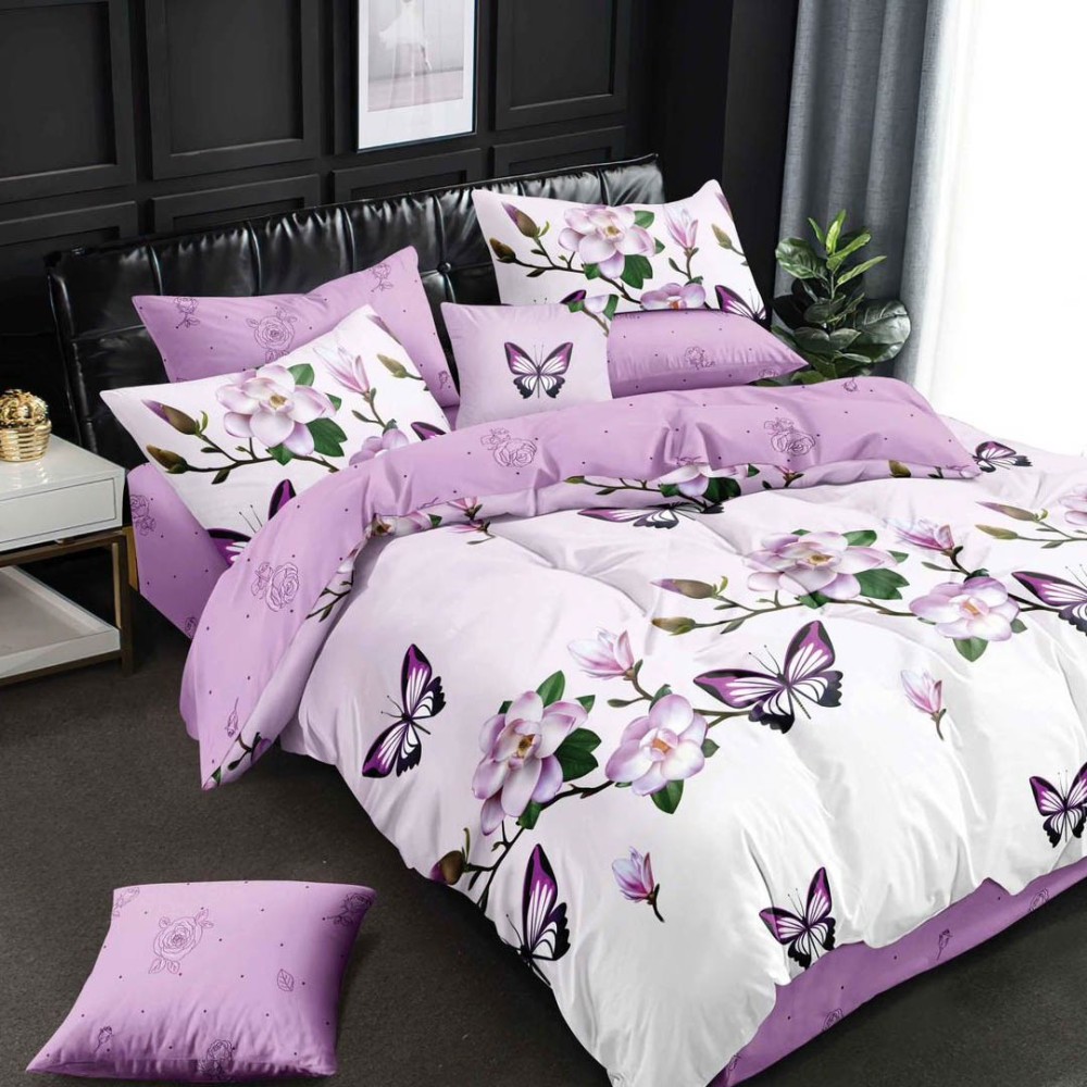 Lenjerie pat dublu cu ELASTIC, Finet, 6 piese, Alb, Lila, fluturi, Talo, cod produs: SKT-FE-08