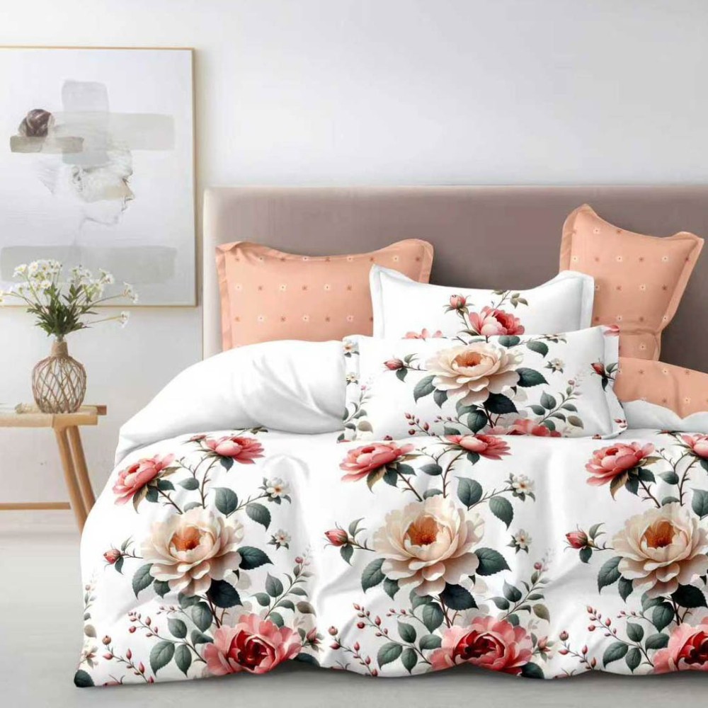 Lenjerie pat dublu cu ELASTIC, Finet, 6 piese, Alb, Roz, flori, Talo, cod produs: SKT-FE-05