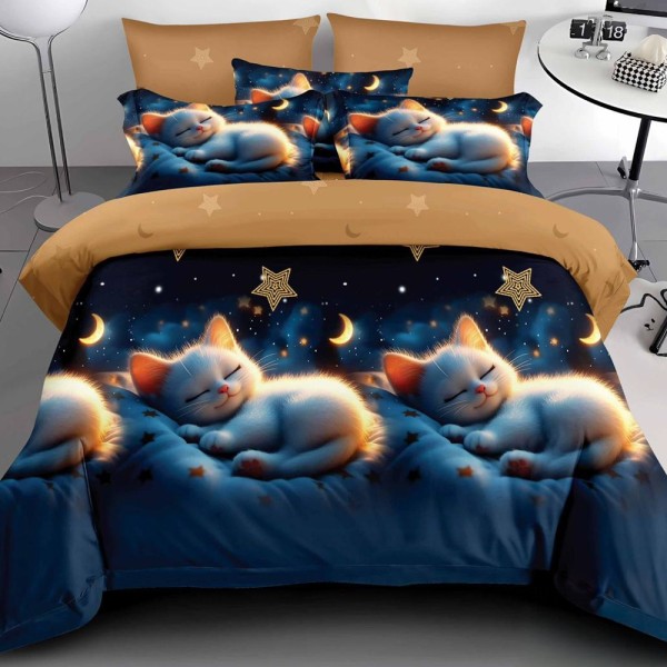 Lenjerie pat dublu cu ELASTIC, Finet, 6 piese, Albastru, pisicute, Johny Home Pucioasa, cod produs: SPR-T-336