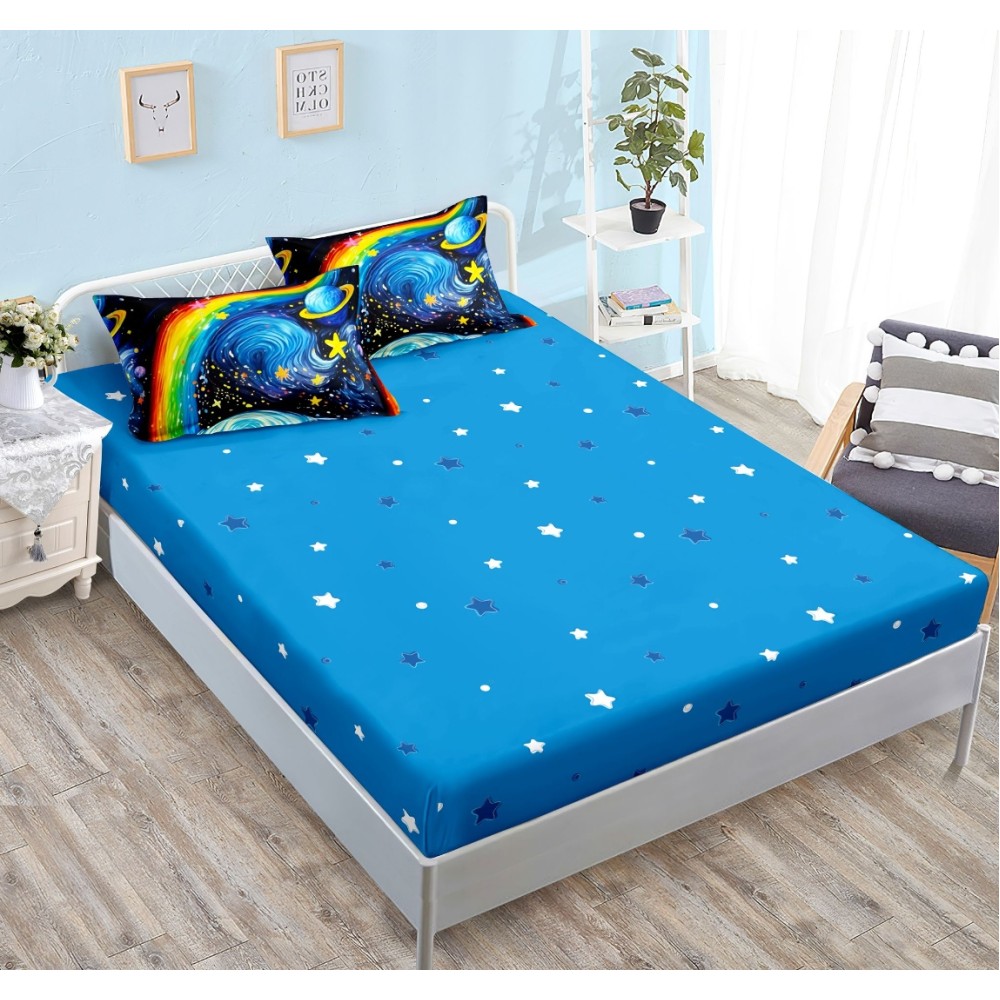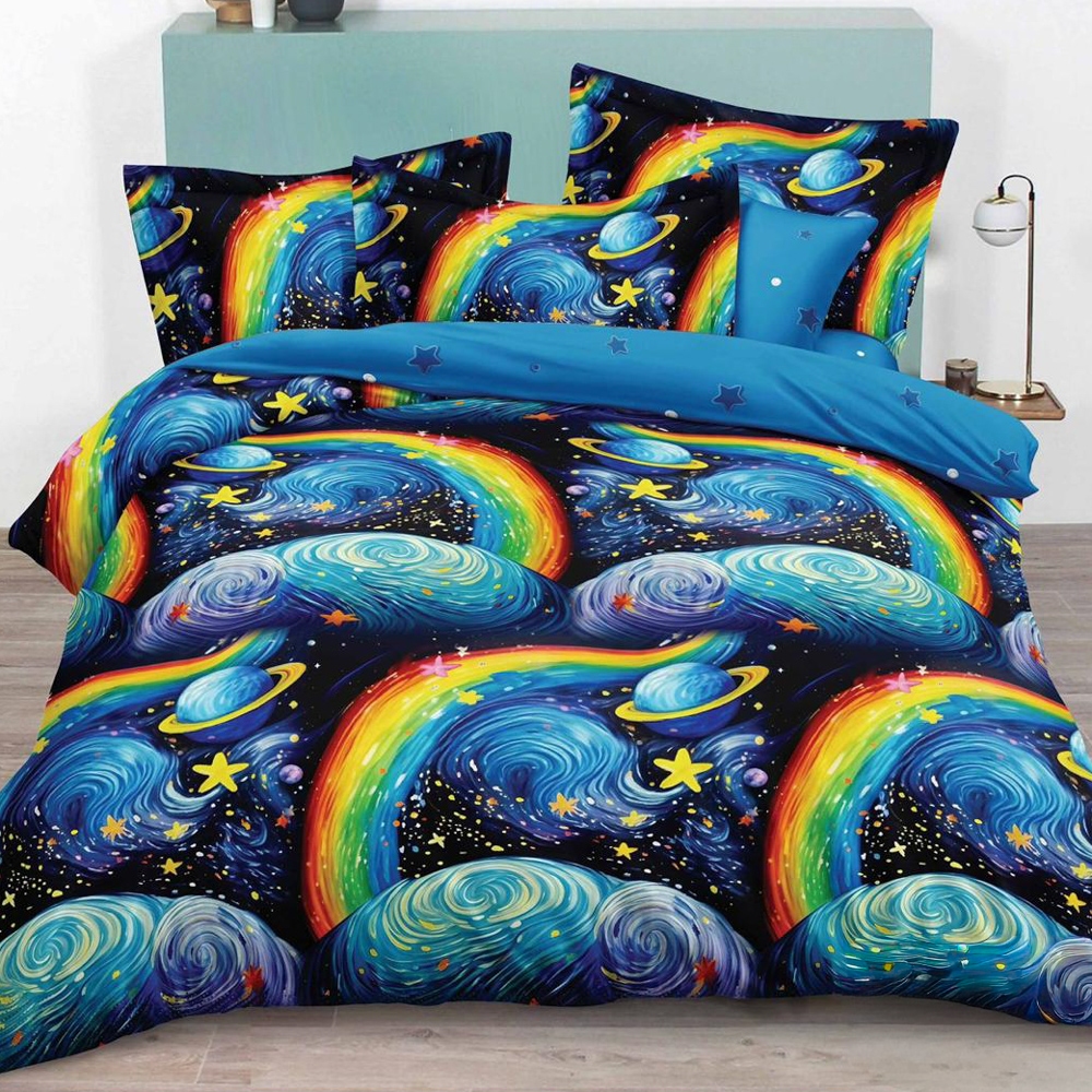 Lenjerie pat dublu cu ELASTIC, Finet, 6 piese, albastru, planete, Johny Home Pucioasa, cod produs: SPR-T-325