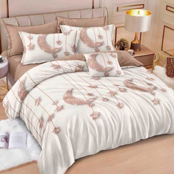 Lenjerie pat dublu cu ELASTIC, Finet, 6 piese, Bej, luna si stele, Johny Home Pucioasa, cod produs: SPR-T-339