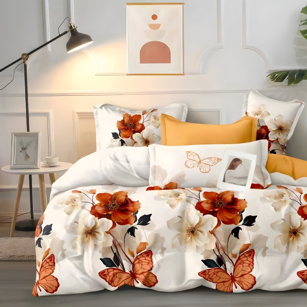 Lenjerie pat dublu cu ELASTIC, Finet, 6 piese, Crem, flori, Talo, cod produs: SKT-FEX-41