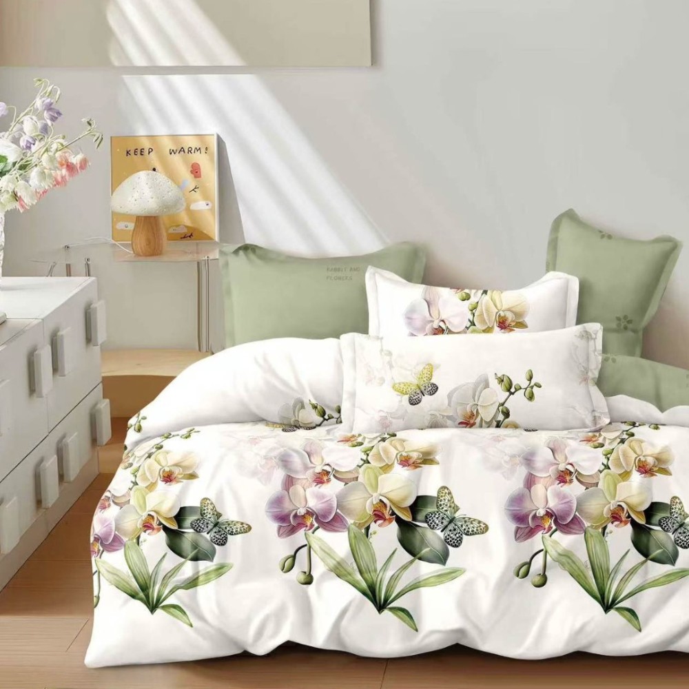 Lenjerie pat dublu cu ELASTIC, Finet, 6 piese, Crem, Verde, flori, Talo, cod produs: SKT-FE-24