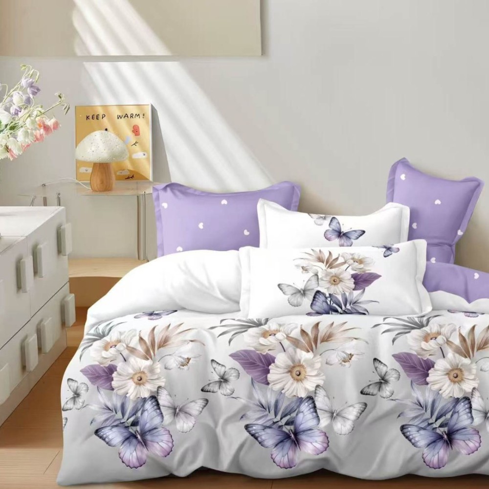 Lenjerie pat dublu cu ELASTIC, Finet, 6 piese, Lila, Gri, flori si fluturi, Talo, cod produs: SKT-FE-16