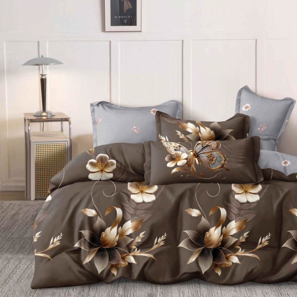 Lenjerie pat dublu cu ELASTIC, Finet, 6 piese, Maro, flori, Talo, cod produs: SKT-FE-09