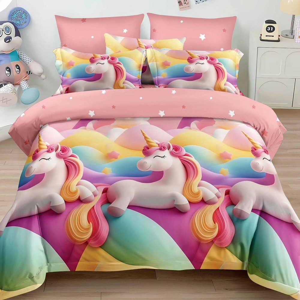Lenjerie pat dublu cu ELASTIC, Finet, 6 piese, Multicolor, unicorni, Johny Home Pucioasa, cod produs: SPR-T-332