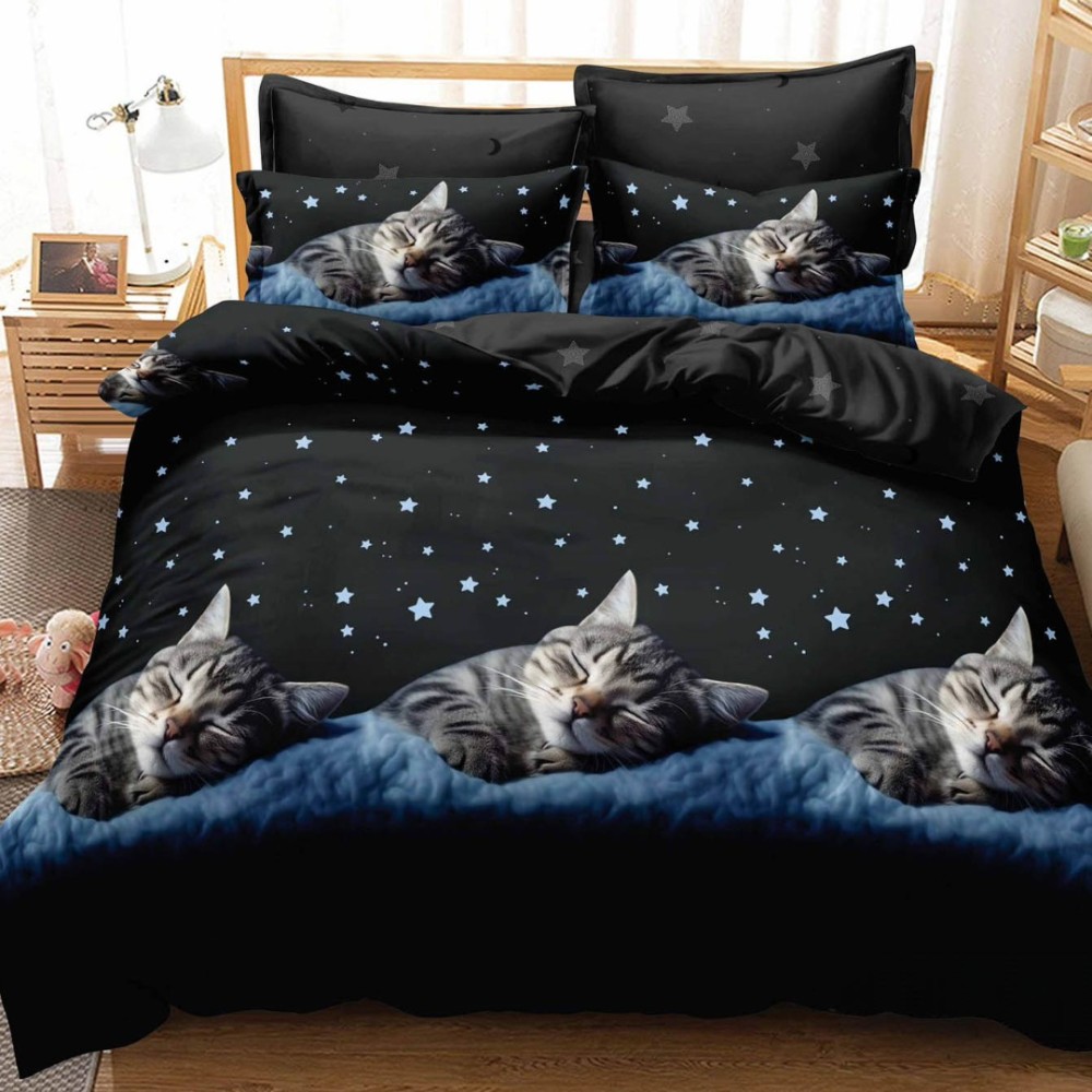 Lenjerie pat dublu cu ELASTIC, Finet, 6 piese, Negru, pisicute, Johny Home Pucioasa, cod produs: SPR-T-323