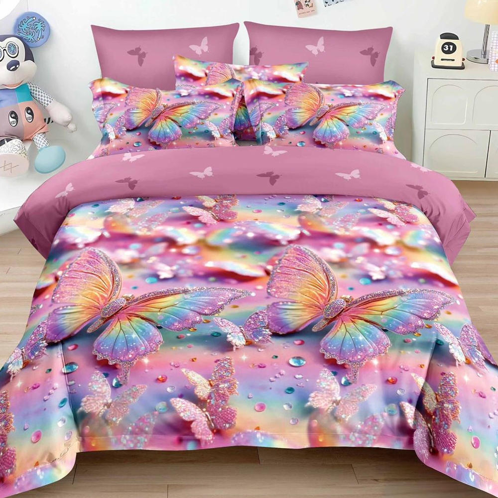 Lenjerie pat dublu cu ELASTIC, Finet, 6 piese, Roz, fluturi, Johny Home Pucioasa, cod produs: SPR-T-328