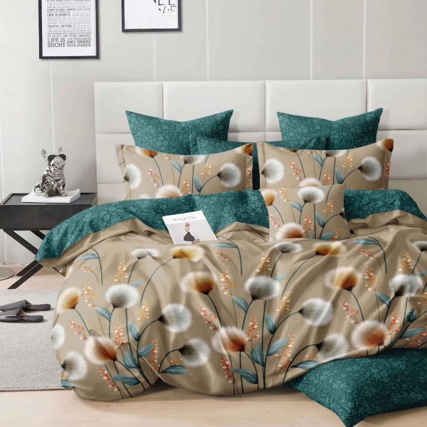 Lenjerie pat dublu cu ELASTIC, Finet, 6 piese, Verde, Bej, flori, Talo, cod produs: SKT-FE-29