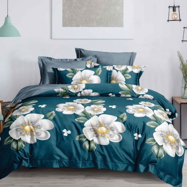 Lenjerie pat dublu cu ELASTIC, Finet, 6 piese, Verde, flori, Talo, cod produs: SKT-FE-35