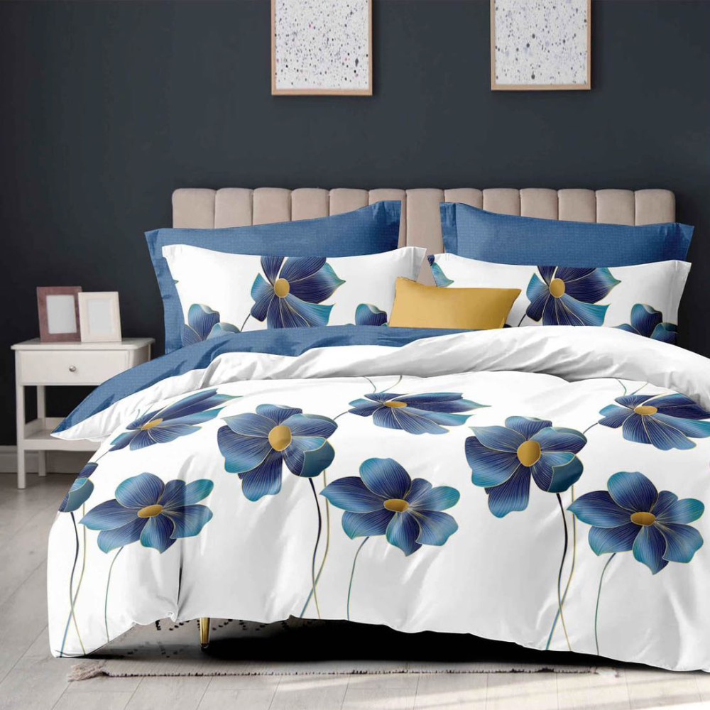 Lenjerie pat dublu, Finet, 6 piese, Alb, Albastru, flori, Talo, cod produs: SKT-FN-64
