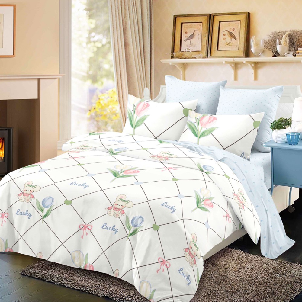 Lenjerie Pat Dublu, FINET, 6 piese, Alb, Bleu, Ursuleti, Flori, Super Design Pucioasa, cod produs: SDP-FNC-623