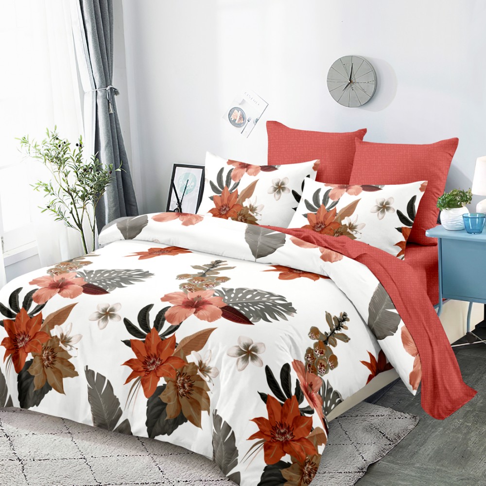 Lenjerie Pat Dublu, FINET, 6 piese, Alb, Caramiziu, Flori, Frunze, Super Design Pucioasa, cod produs: SDP-FNC-737