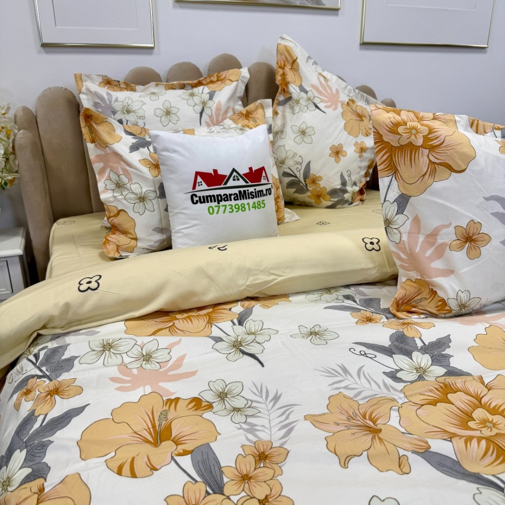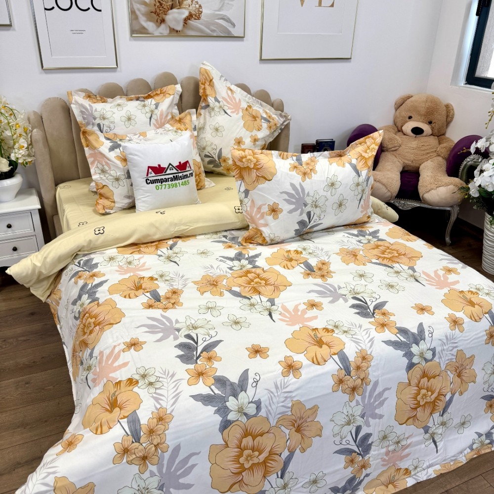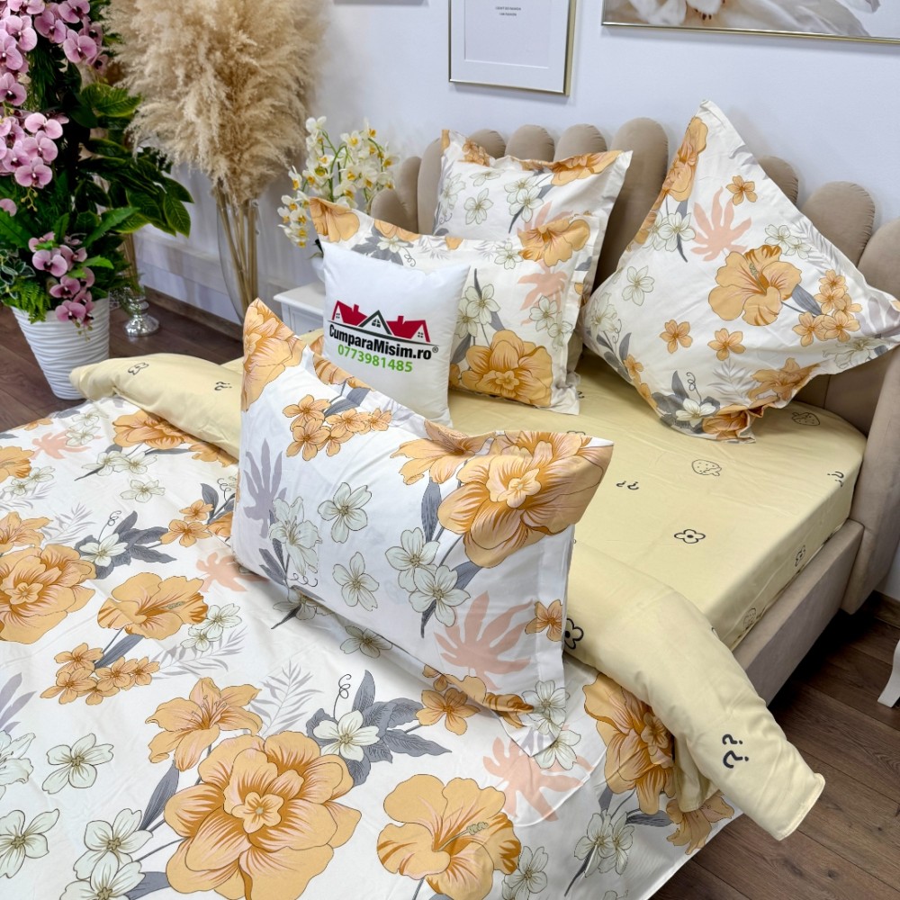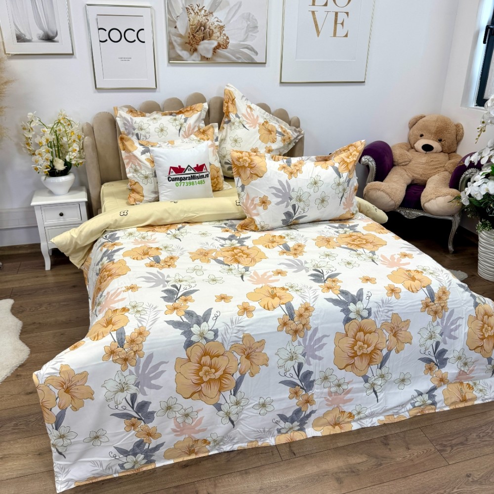 Lenjerie pat dublu, Finet, 6 piese, Alb, Galben, flori, Talo, cod produs: SKT-FN-37