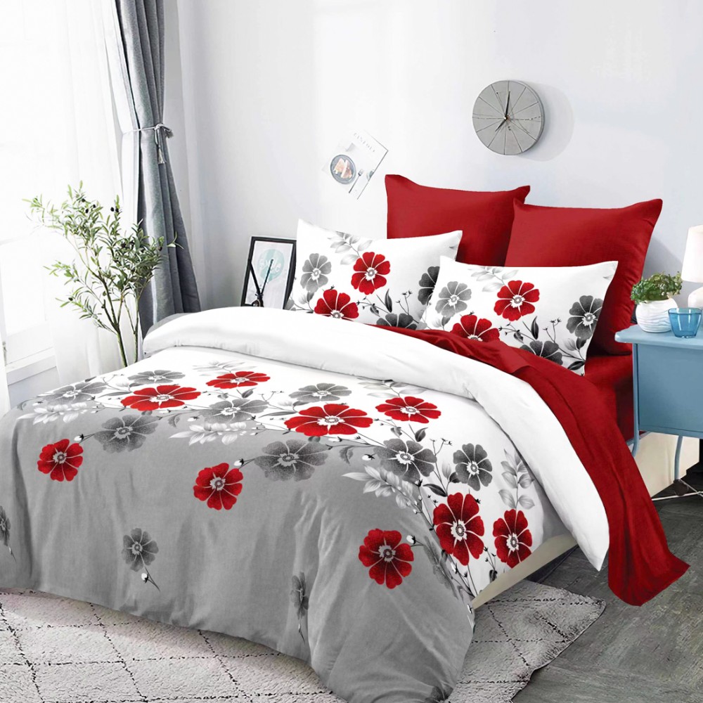 Lenjerie Pat Dublu, FINET, 6 piese, Alb, Gri, Rosu, Flori, Super Design Pucioasa, cod produs: SDP-FNC-756